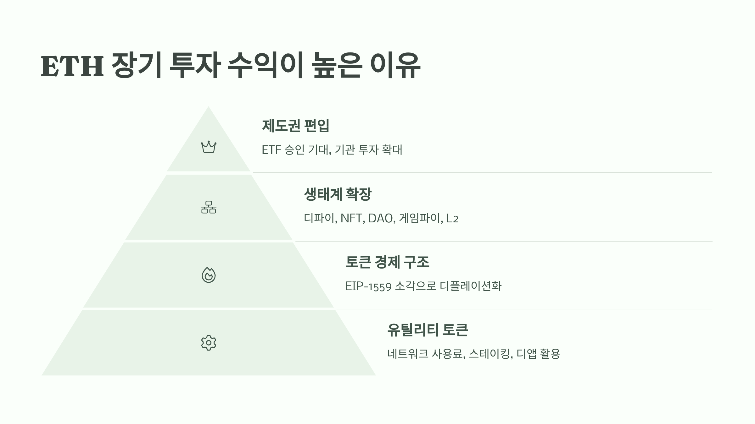 이더리움의 장기 투자 수익률이 높은 이유는 단순히 가격 상승 때문만은 아니에요. 가장 핵심은 ETH 자체가 ‘유틸리티 토큰’이라는 점이에요. 네트워크 사용료, 스테이킹, 디앱 사용 등 생태계에서 직접적으로 사용돼요.