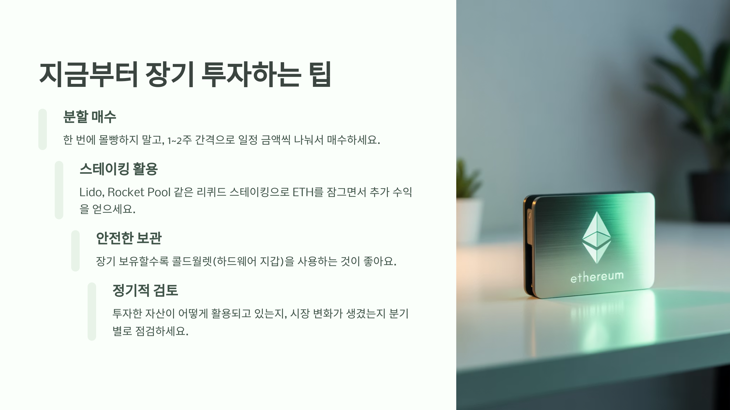 지금부터 ETH 장기 투자를 시작하고 싶다면 가장 중요한 건 ‘분할 매수’예요. 한 번에 몰빵하지 말고, 1주~2주 간격으로 일정 금액씩 나눠서 매수하면 시장의 단기 등락에 휘둘리지 않아요.