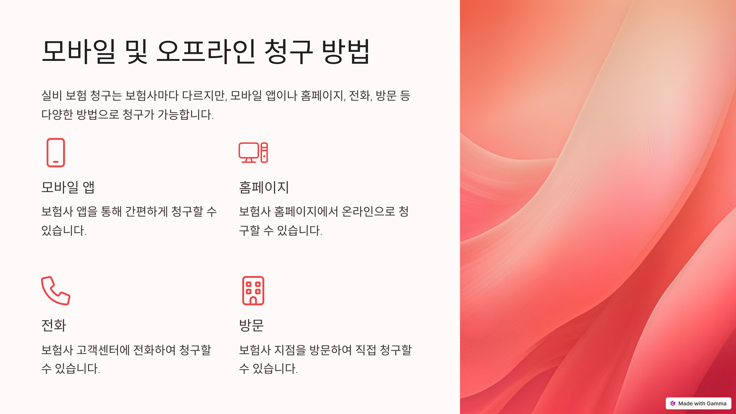 실비 보험은 모바일과 오프라인 두 가지 방법으로 청구할 수 있어요. 요즘에는 스마트폰 앱을 이용해 간편하게 처리하는 경우가 많지만, 오프라인 방문 접수도 여전히 가능한 방법이에요.