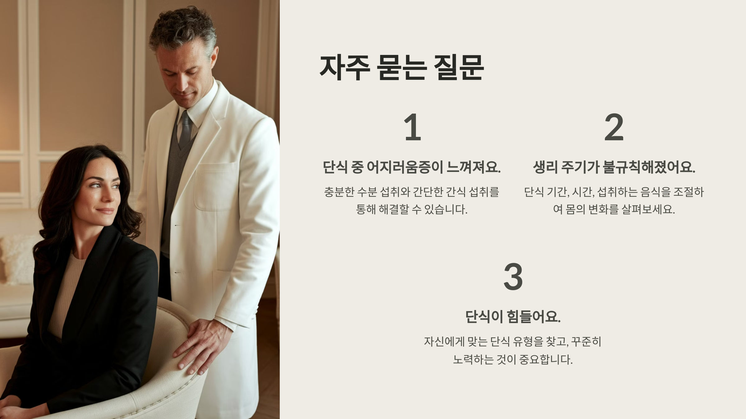 A1. 모든 여성에게 적합하지는 않아요. 호르몬 불균형, 저체중, 임신 중인 경우 단식을 피하는 것이 좋아요.