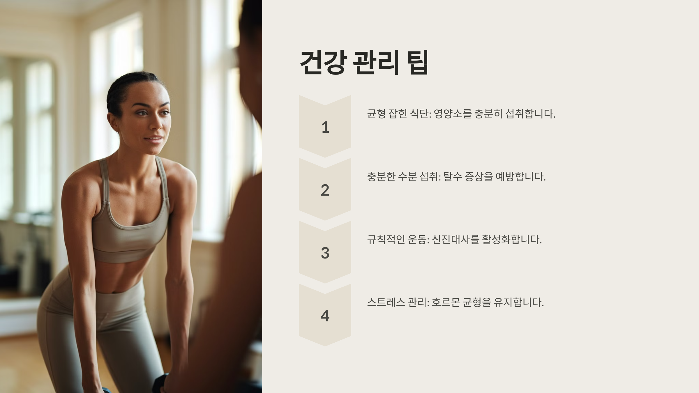 4. **스트레스 관리**: 여성의 호르몬 균형은 스트레스에 민감하므로 명상이나 요가 같은 스트레스 완화 활동을 병행하는 것이 좋아요.