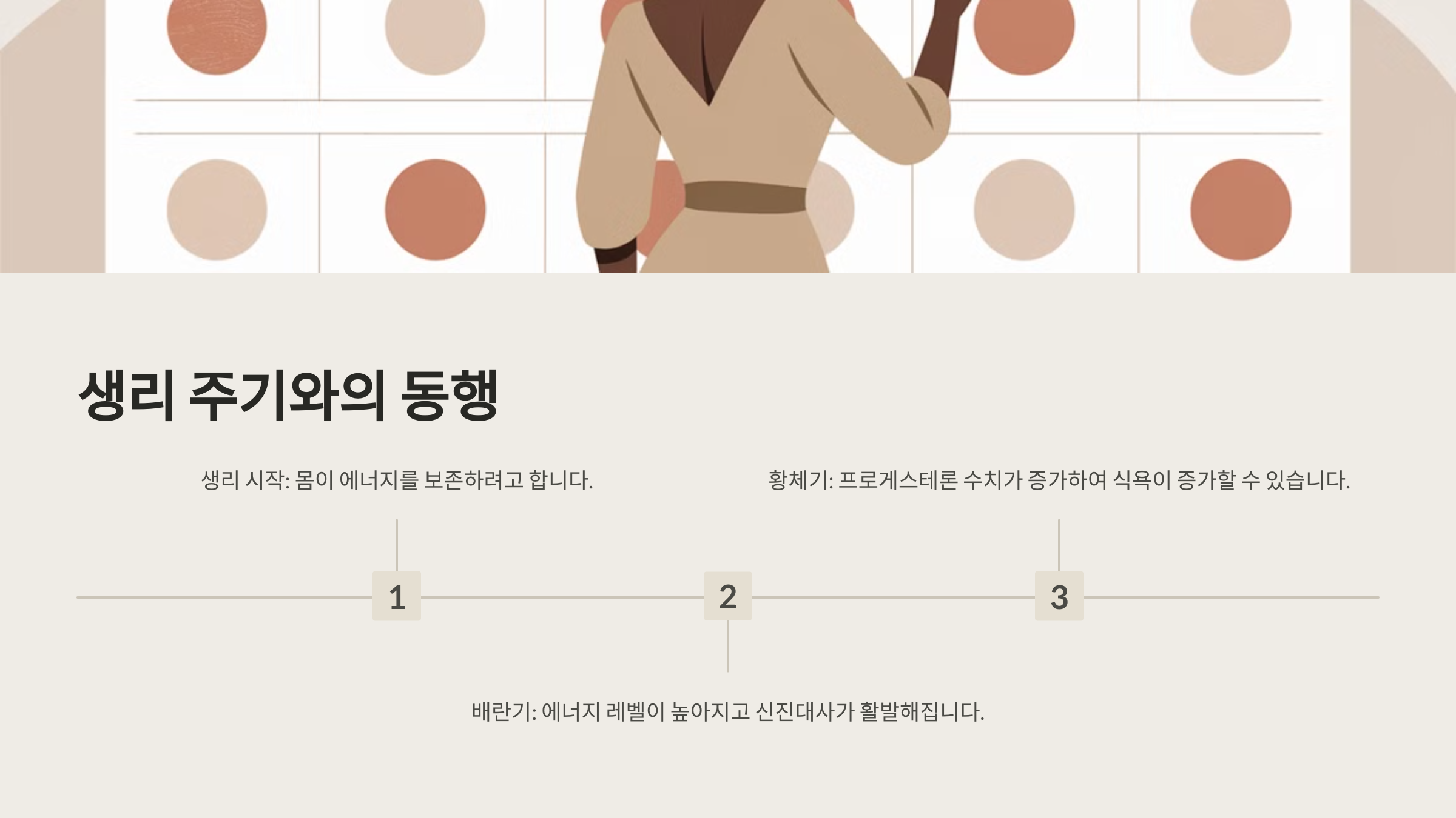3. **배란기(난포기 후 약 2주차)**: 배란 시기에는 신체 대사가 더 빨라지면서 에너지 소모가 커지지만, 동시에 식욕도 늘어날 수 있어요. 이 시기에는 단식의 시간을 짧게 가져가거나 간헐적으로 단식을 중단해도 괜찮아요.