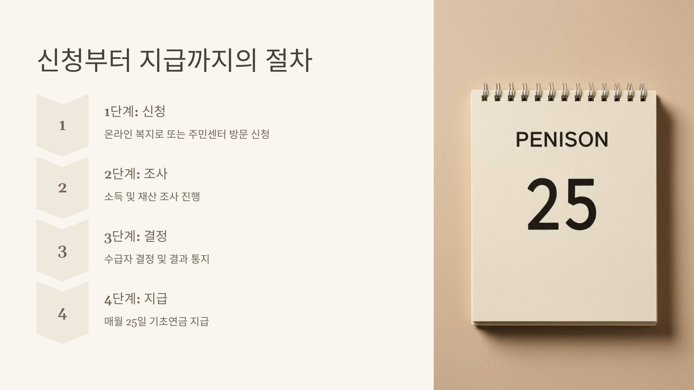 | 4️⃣ 연금 지급 개시 | 결정 후 매월 25일 연금 지급 (은행 계좌 입금) |