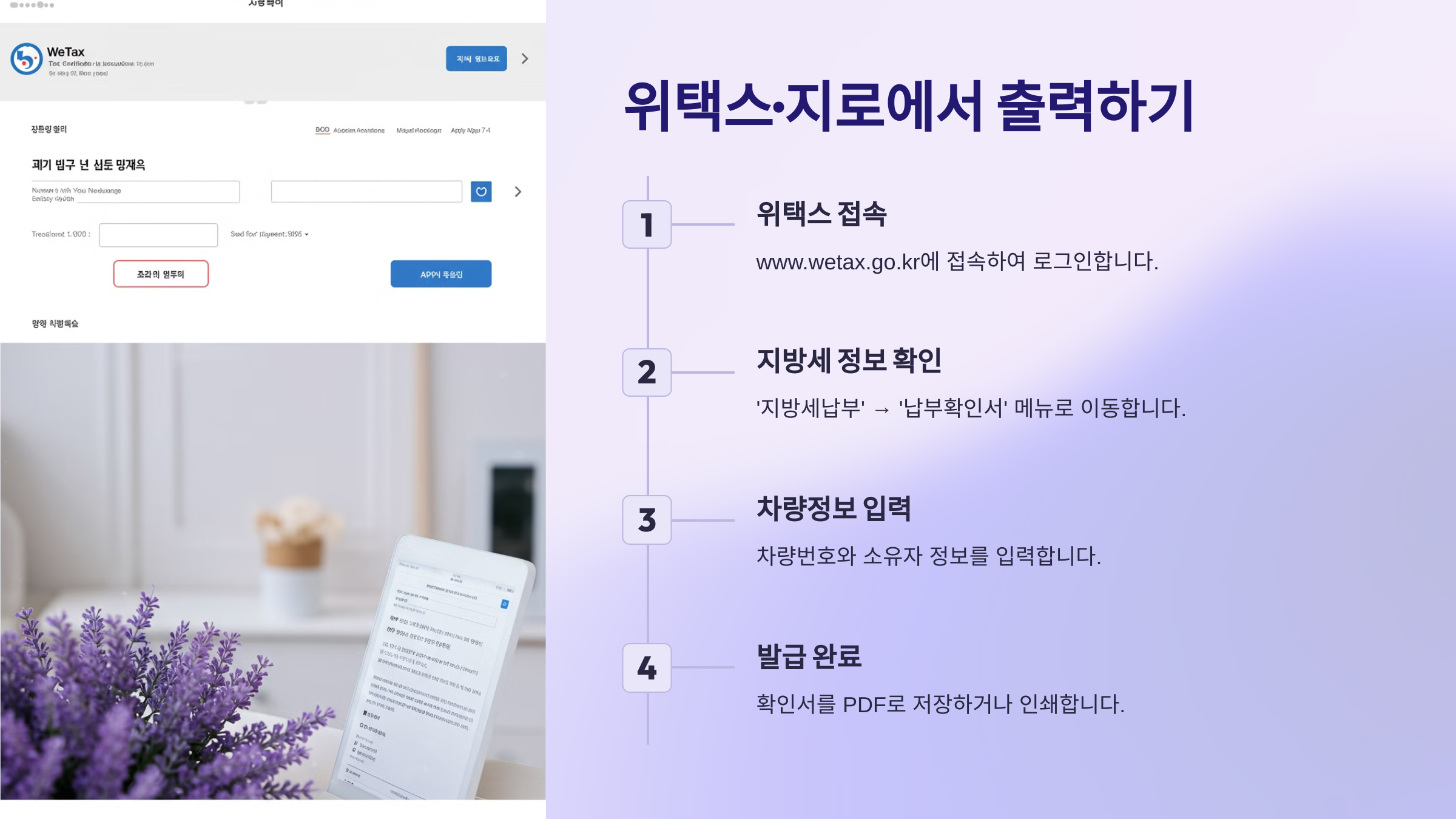 지방세 전문 플랫폼인 '위택스'(www.wetax.go.kr)는 자동차세 납부확인서 출력의 대표적인 방법이에요.