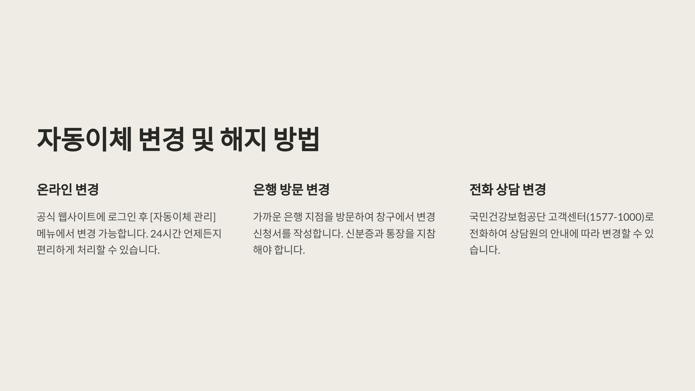 📌 참고로, 자동이체 해지 후 체납상태가 지속되면 건강보험공단에서 압류, 독촉까지 진행할 수 있어요. 이건 정말 조심해야 해요!