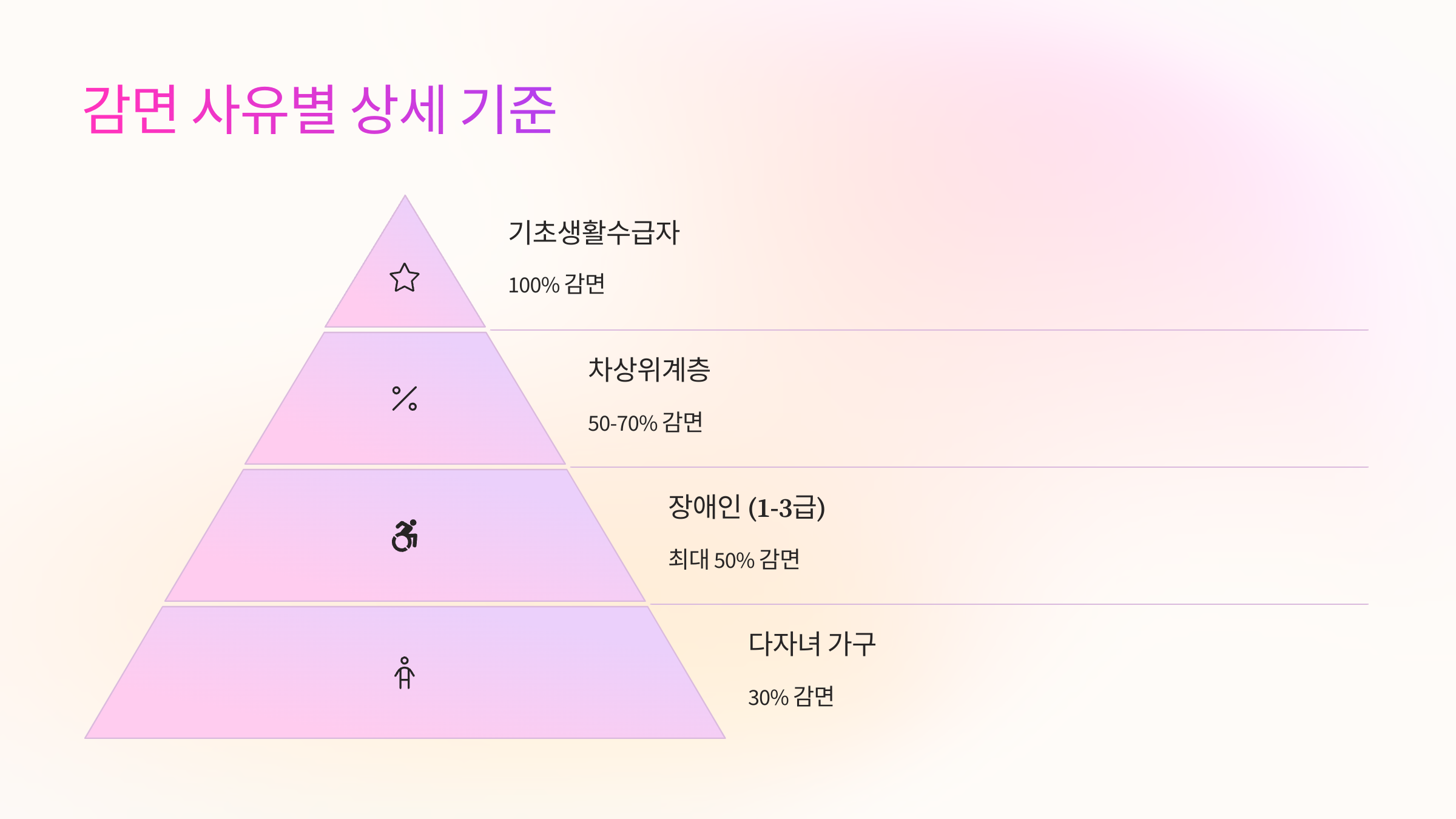 감면 대상은 사회적 약자, 경제적 위기자, 재난 피해자 등으로 정해져 있어요.
