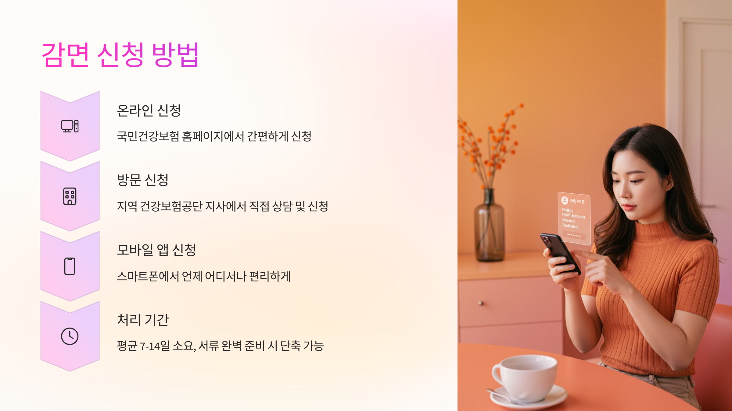 걱정 마세요. 감면 신청은 생각보다 간단해요. 온라인, 방문, 전화 모두 가능하거든요. ☎️
