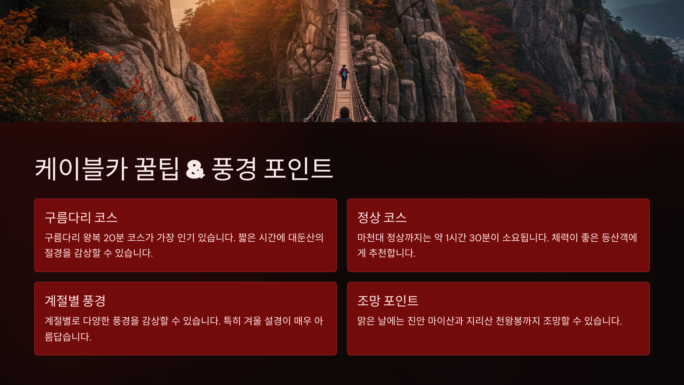 하산할 때는 케이블카를 이용해도 되고, 도보로 내려오며 대둔산 절벽과 구름다리를 즐기는 것도 추천드려요 🥾