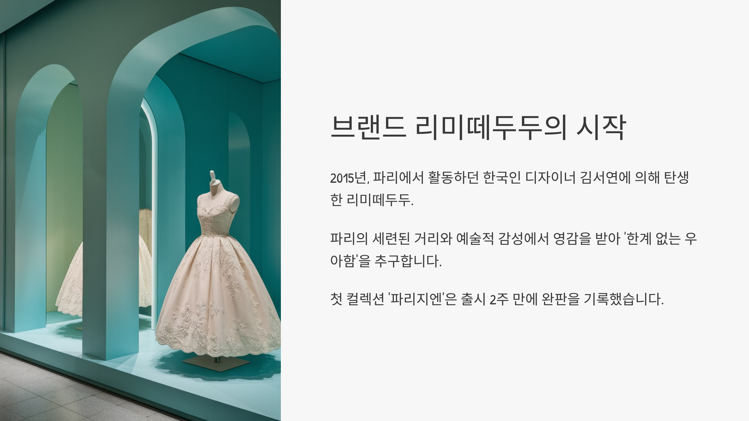 리미떼두두의 가장 큰 매력은 단순한 옷이 아니라 ‘스토리를 입힌 옷’을 만든다는 점이에요. 매 시즌마다 브랜드만의 이야기를 설정하고, 그에 맞는 컬러와 디테일, 촬영 분위기까지 모두 맞춰가는 방식으로 완성도를 높이고 있어요.