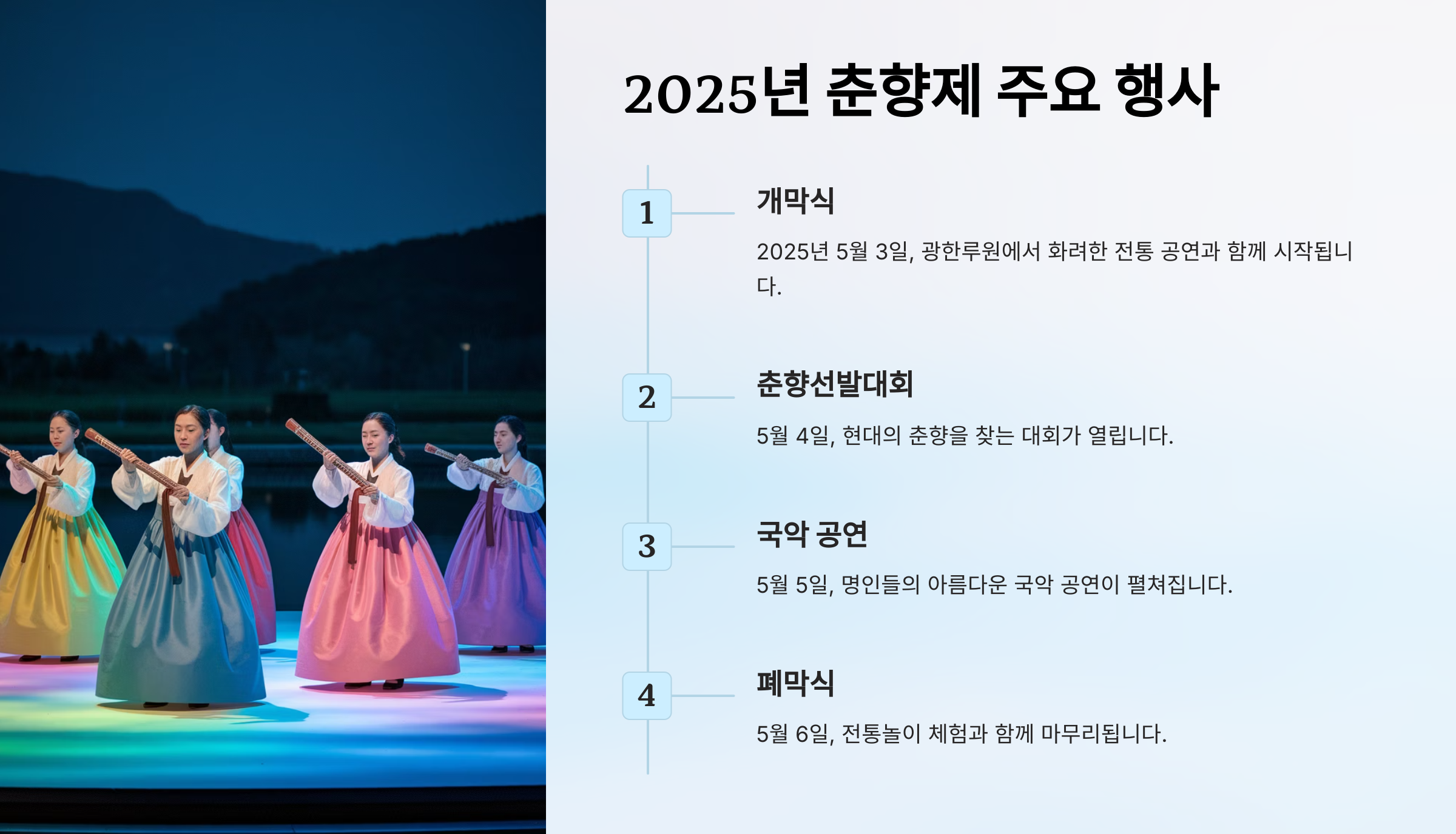2025년 춘향제는 더욱 풍성하고 다채로운 프로그램으로 여러분을 맞이해요! 5월 3일부터 5월 7일까지 5일간 열리는 이번 축제는 전통과 현대가 어우러진 최고의 축제로 꾸며질 예정이랍니다. 올해의 테마는 “춘향, 사랑을 노래하다”예요.