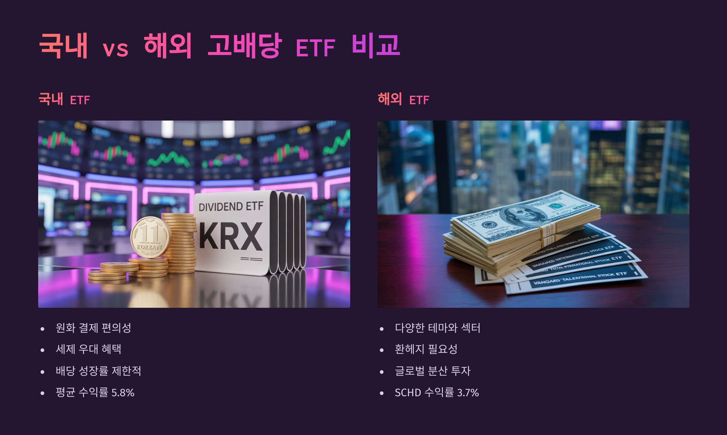 국내 고배당 ETF와 해외 고배당 ETF는 각각 장단점이 명확해요. 먼저, 국내 고배당 ETF는 원화로 투자할 수 있어서 환위험이 없고 세금이 간단해요. 또한, 한국 주식시장에 익숙한 투자자라면 접근성 면에서 유리하죠.