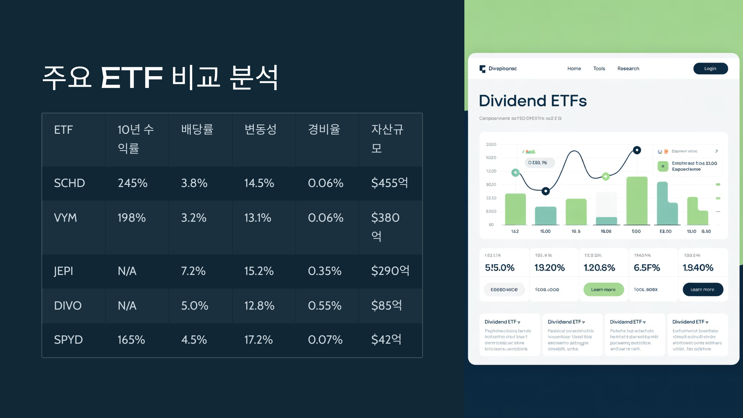 | SCHD | Schwab | 3.5% | 성장성과 수익률 균형 우수 |