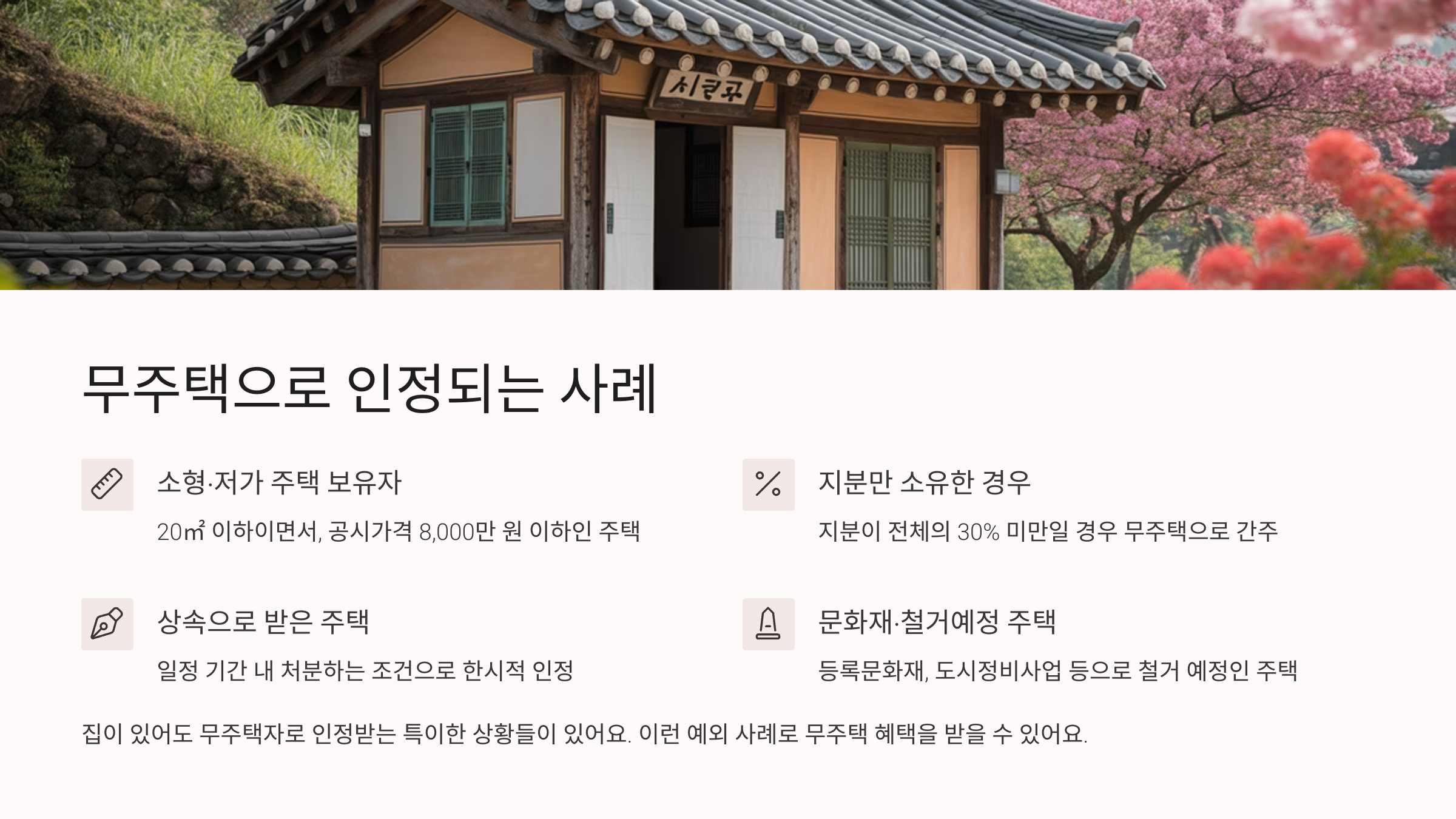 📌 **4. 문화재·철거예정 주택** 등록문화재로 지정된 주택, 도시정비사업 등으로 철거 예정인 주택은 거주 및 처분 불가 조건이기 때문에 무주택으로 보기도 해요.