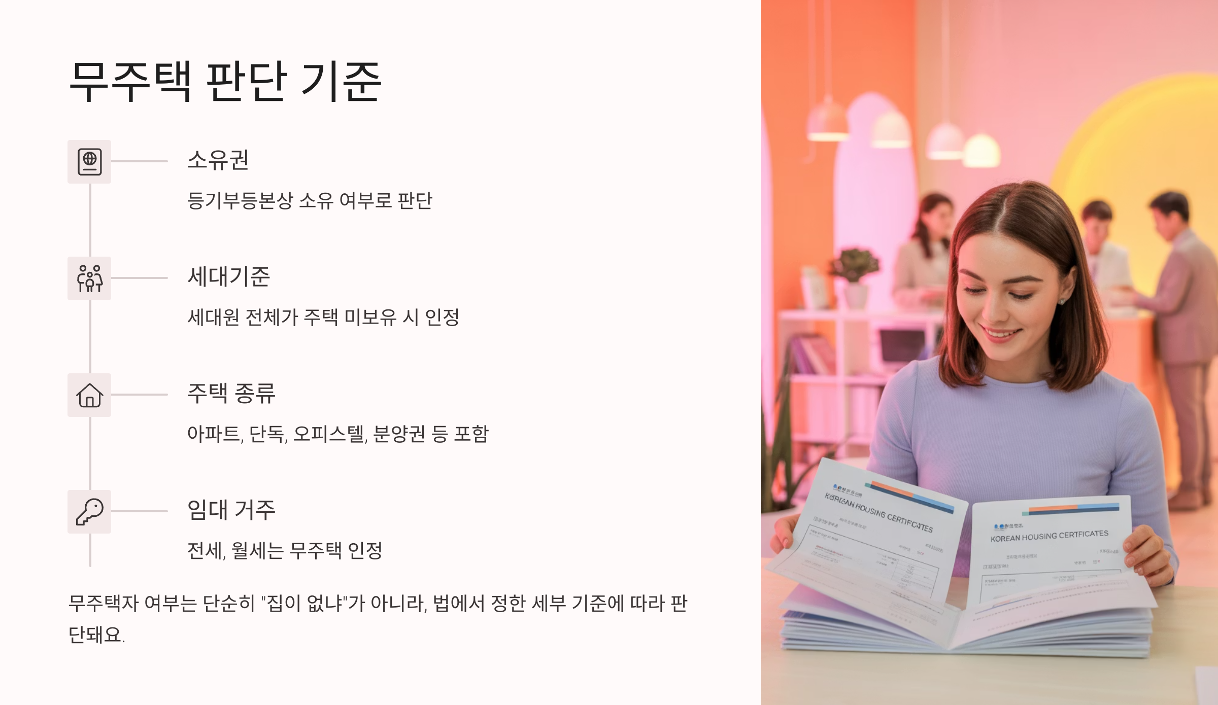 📌 예를 들어, 미혼 성인이 부모님과 함께 살고 있고 부모가 주택을 보유하고 있다면, 본인은 무주택자가 아니에요. 반대로 세대 분리를 해 주소를 따로 두고 독립 생계를 유지하는 경우엔 무주택자로 인정받을 수 있어요.