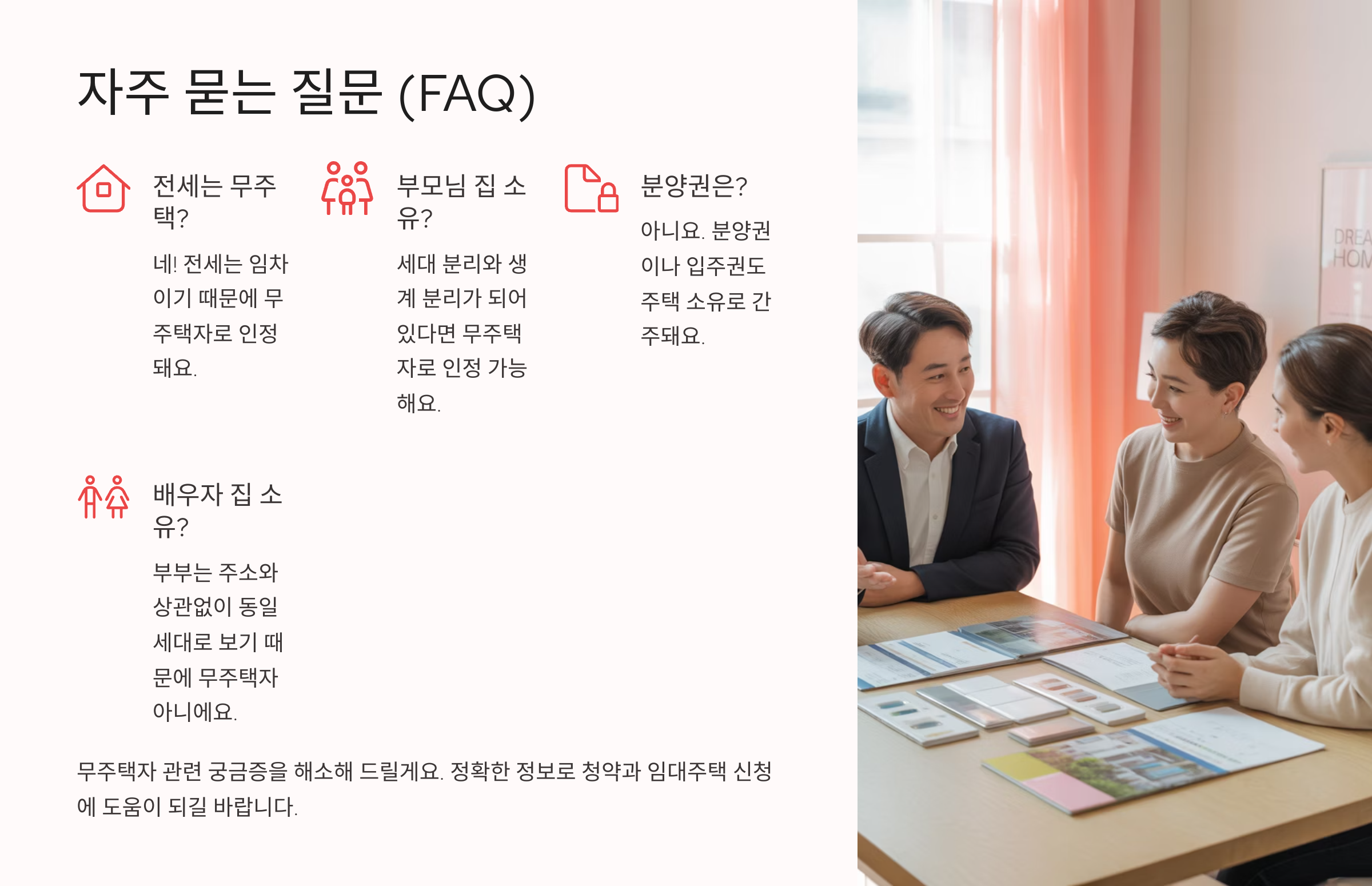 다만 세대 분리를 했더라도, **혼인 관계에 있는 배우자는 무조건 같은 세대로 본다**는 점을 꼭 기억하세요. 주소지가 다르더라도 부부는 동일 세대로 간주되며, 배우자 중 한 명이 주택을 가지고 있다면 두 사람 모두 무주택자가 아니에요.