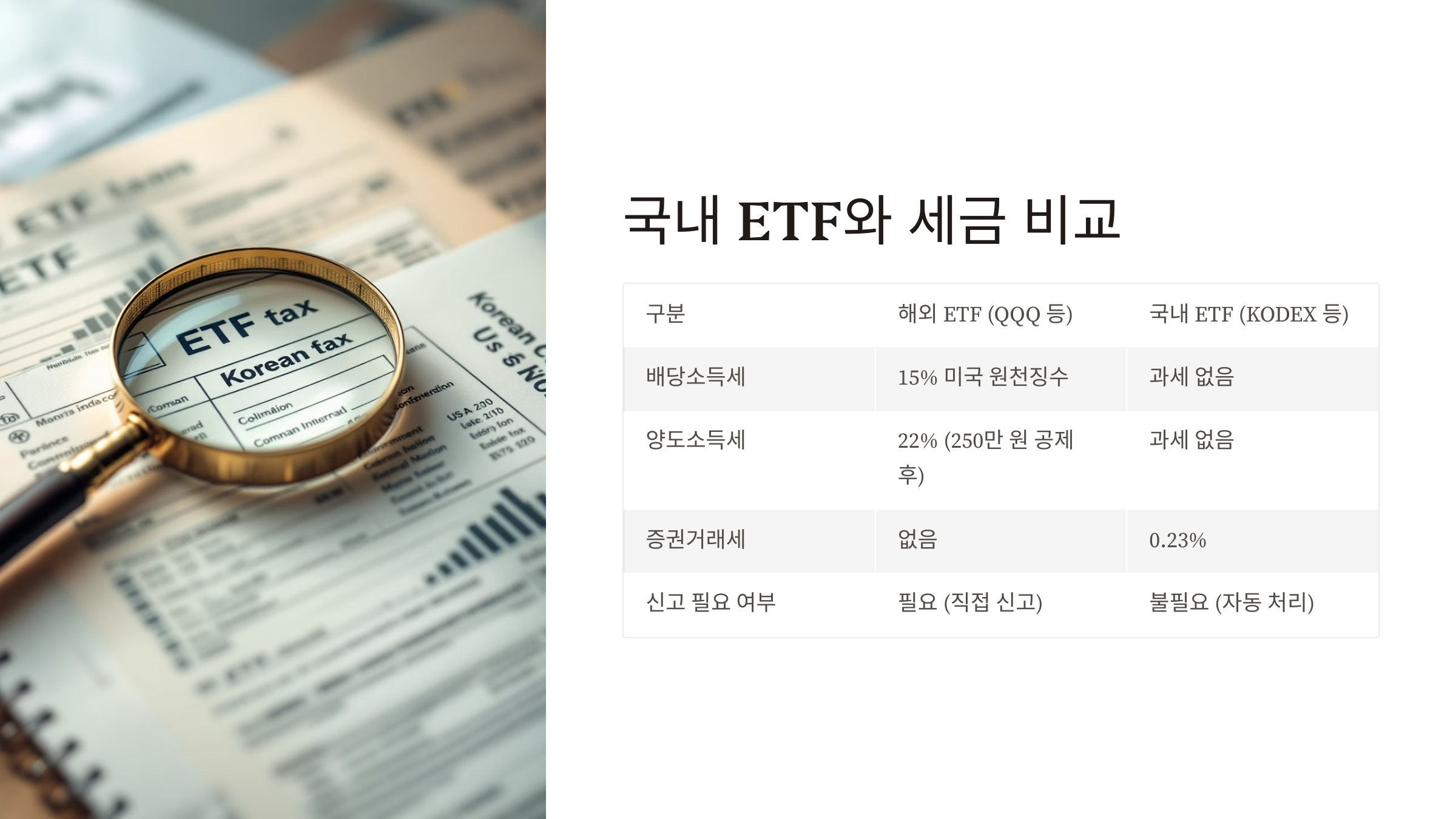해외 상장 나스닥 ETF(QQQ 등)와 국내 상장 ETF(KODEX 미국나스닥100TR 등)는 추종 지수는 같을 수 있지만, 세금 구조는 완전히 달라요. 투자할 때 수익률뿐 아니라 과세 방식도 함께 비교해보는 게 중요해요.