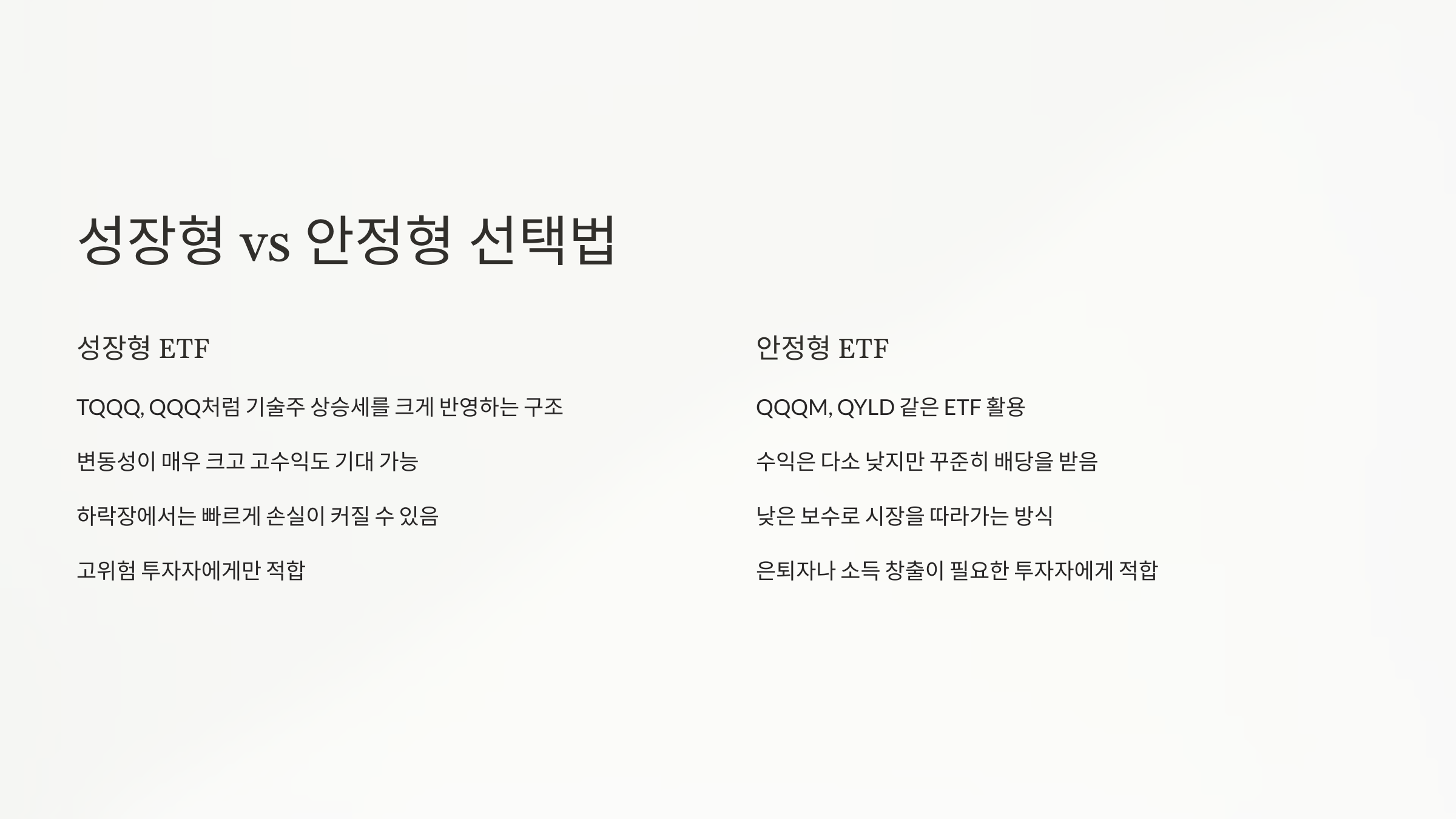 성장형 ETF는 주로 TQQQ, QQQ처럼 기술주의 상승세를 크게 반영하는 구조예요. 변동성이 매우 크고 고수익도 기대할 수 있지만, 하락장에서는 빠르게 손실이 커질 수 있다는 점에서 고위험 투자자에게만 적합해요.