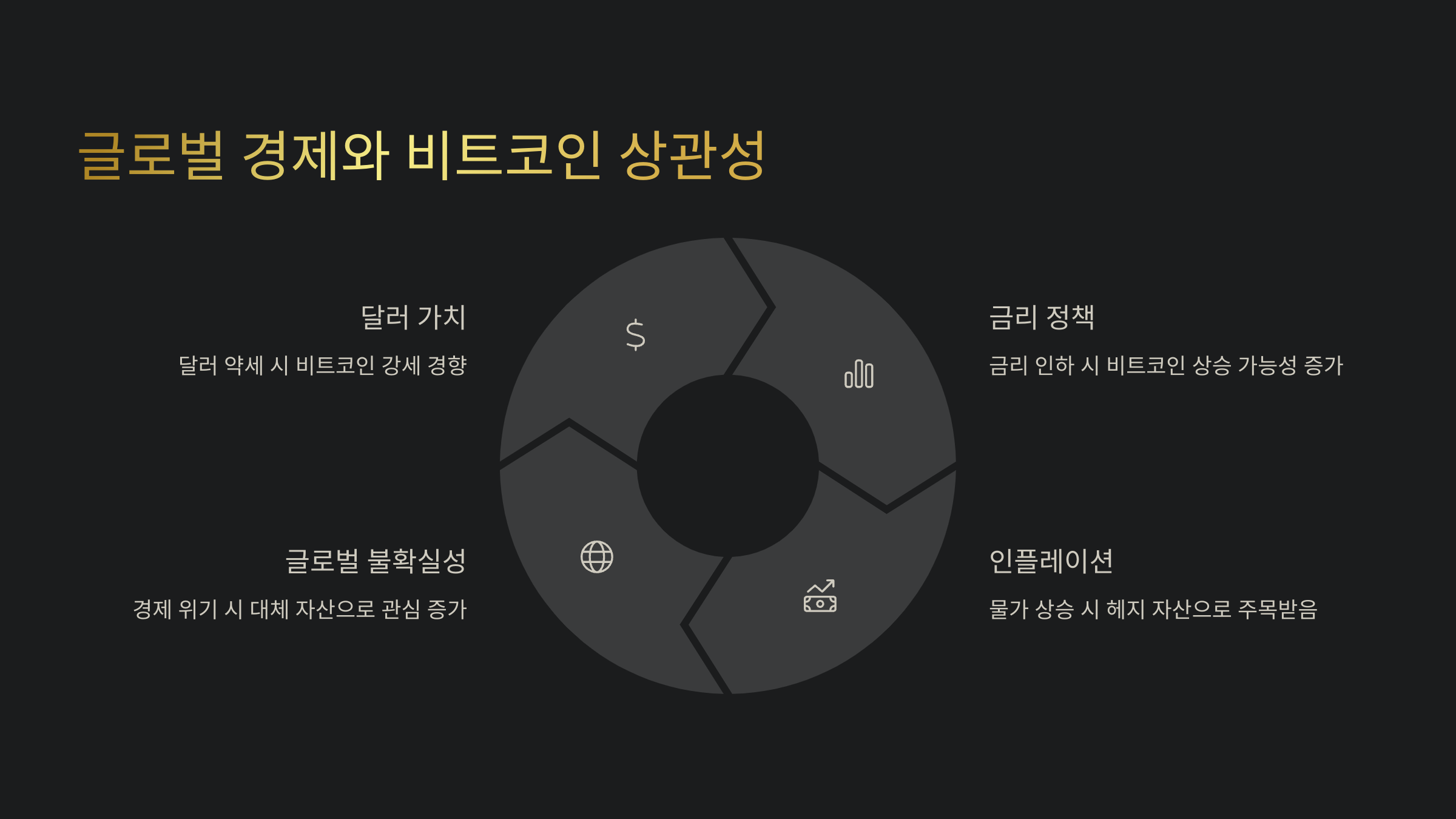 또한 달러 가치와의 역상관 관계도 주목할 만해요. 글로벌 투자자들은 달러 가치가 약세를 보일 때 금이나 비트코인 같은 대체 자산에 관심을 보이곤 해요. 이처럼 비트코인은 점점 더 거시경제 변수에 민감하게 반응하고 있어요.