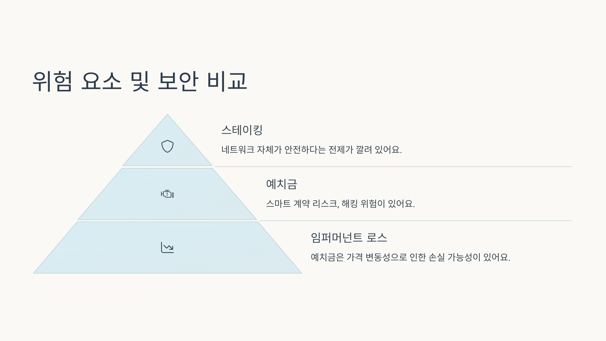 따라서 스테이킹은 보안 중심, 예치금은 수익 중심이지만 그만큼 위험을 수반해요. 자신이 감당 가능한 리스크 수준에 맞게 선택하는 것이 핵심이에요.