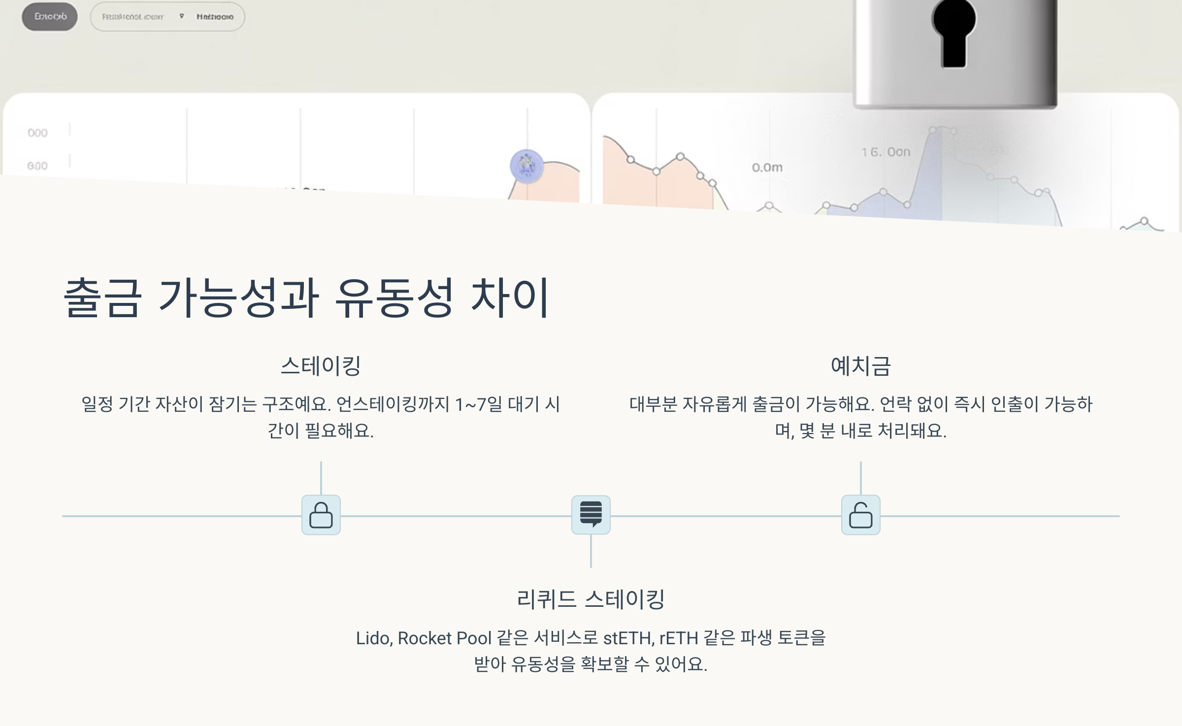 하지만 Lido, Rocket Pool 같은 리퀴드 스테이킹 서비스를 사용하면 stETH, rETH 같은 파생 토큰을 받아 유동성을 확보할 수 있어요. 이 방식은 스테이킹과 동시에 디파이에도 활용할 수 있다는 장점이 있어요.