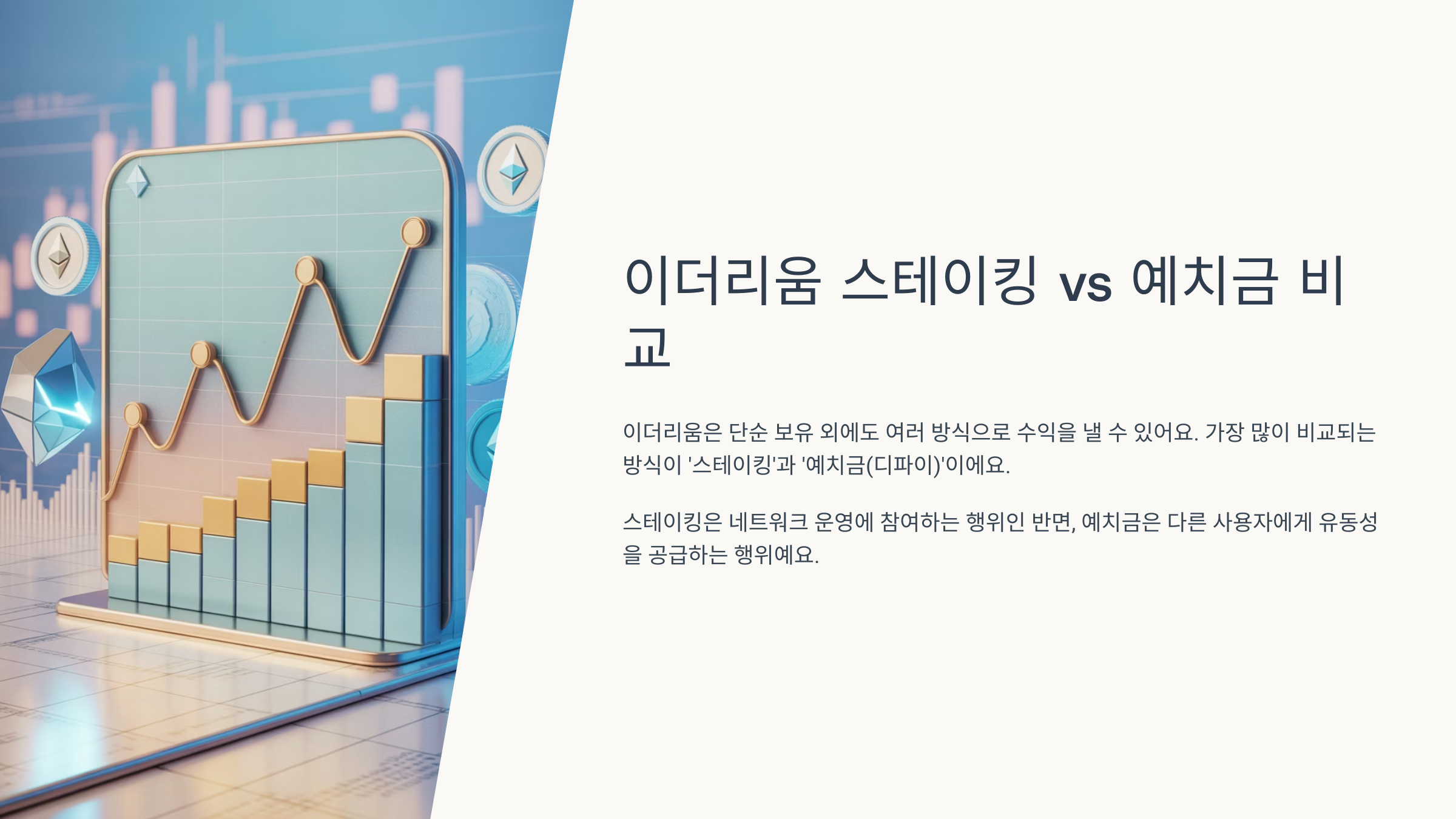 이더리움은 단순 보유 외에도 여러 방식으로 수익을 낼 수 있는 대표적인 코인이에요. 그중에서도 가장 많이 비교되는 방식이 바로 ‘스테이킹’과 ‘예치금(디파이)’이에요. 둘 다 코인을 맡기고 이자를 받는 구조이지만, 목적과 작동 방식이 전혀 달라요.