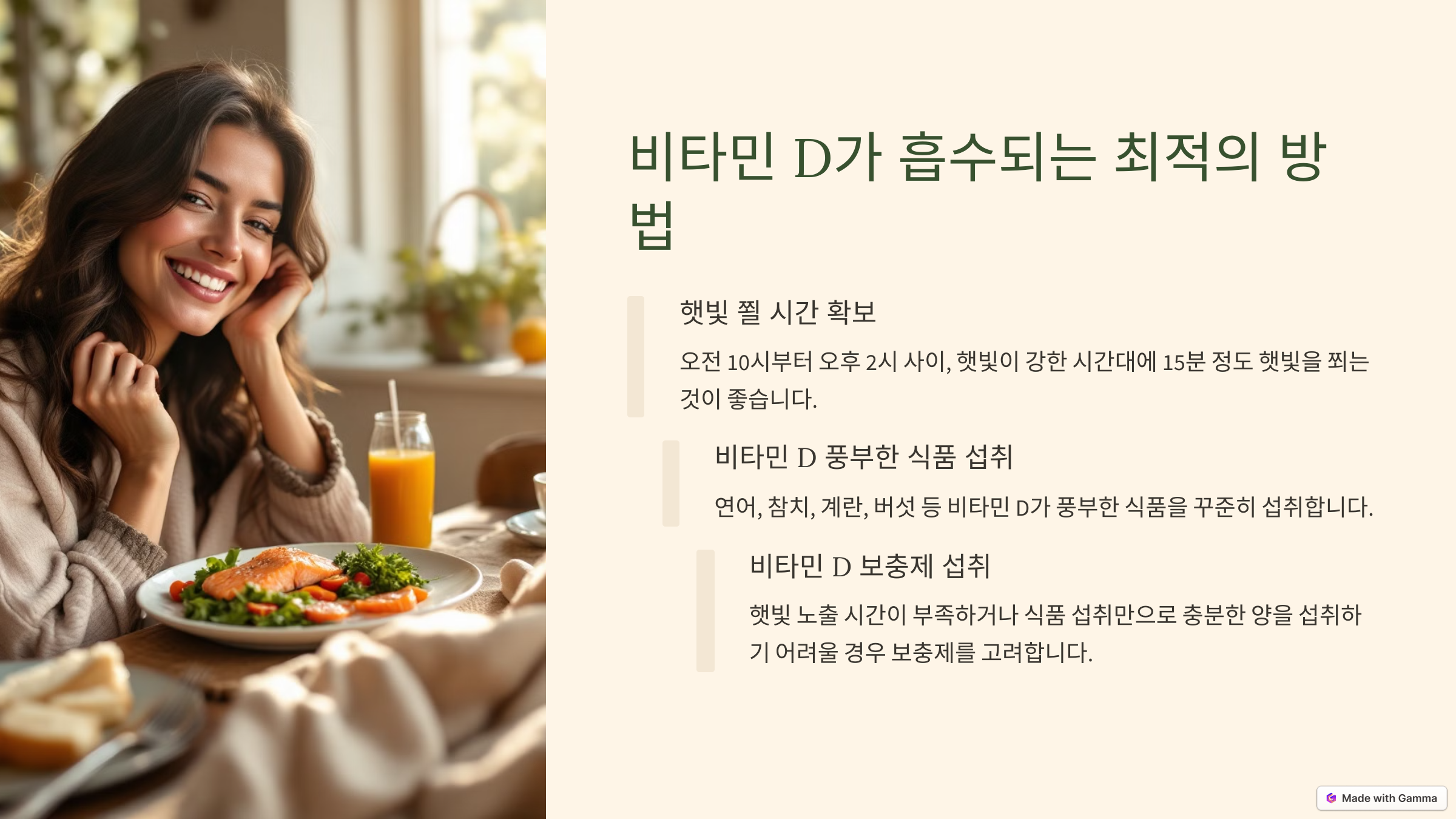 이렇게 비타민 D는 모든 연령대에서 중요한데요, 특히 성장기 어린이에게는 뼈와 근육 발달에 필수적이고, 노년층에게는 골다공증 예방에 큰 도움을 준답니다.