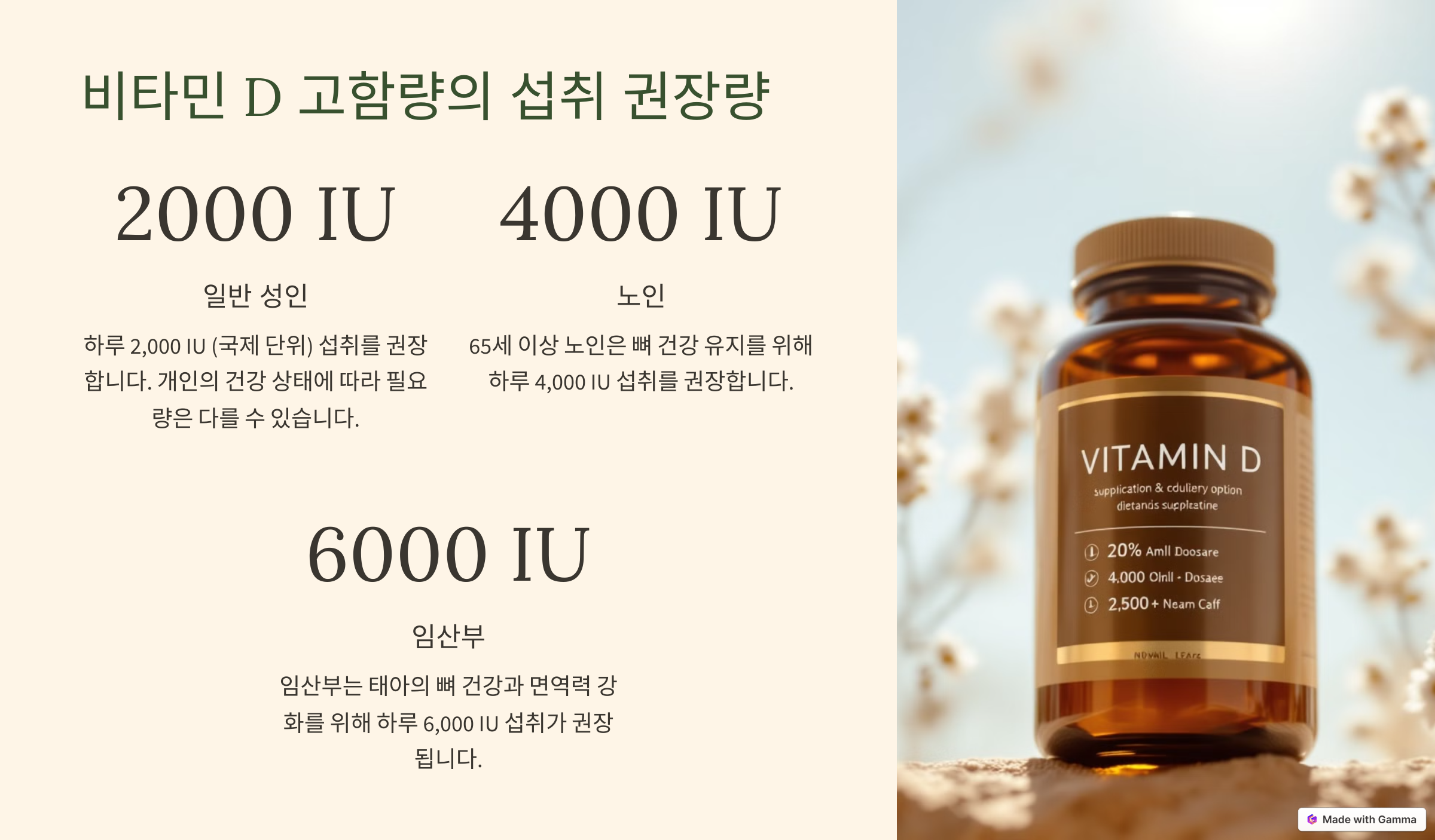 하루 10,000IU 이상의 고용량을 장기간 복용하는 것은 위험할 수 있으니 반드시 의사의 지도를 받는 것이 중요해요. 비타민 D 과잉은 신장에 부담을 주고, 신장 결석이나 신부전 같은 합병증을 일으킬 수 있어요.
