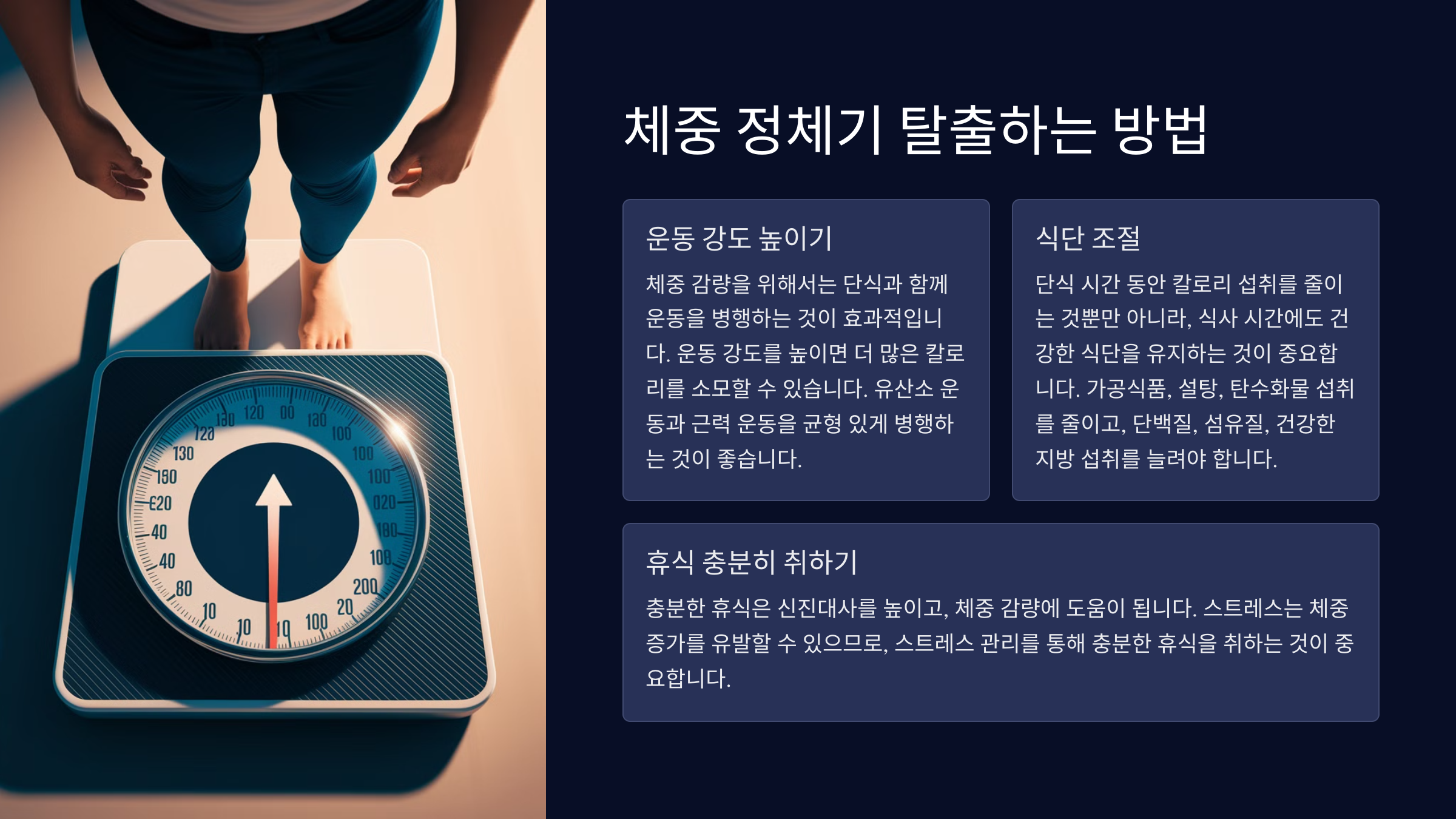 간헐적 단식을 몇 주 또는 몇 달 동안 유지하다 보면 체중 감량이 멈추는 정체기를 경험할 수 있어요. 이때 적절한 방법을 통해 다시 체중 감량을 시작할 수 있어요: