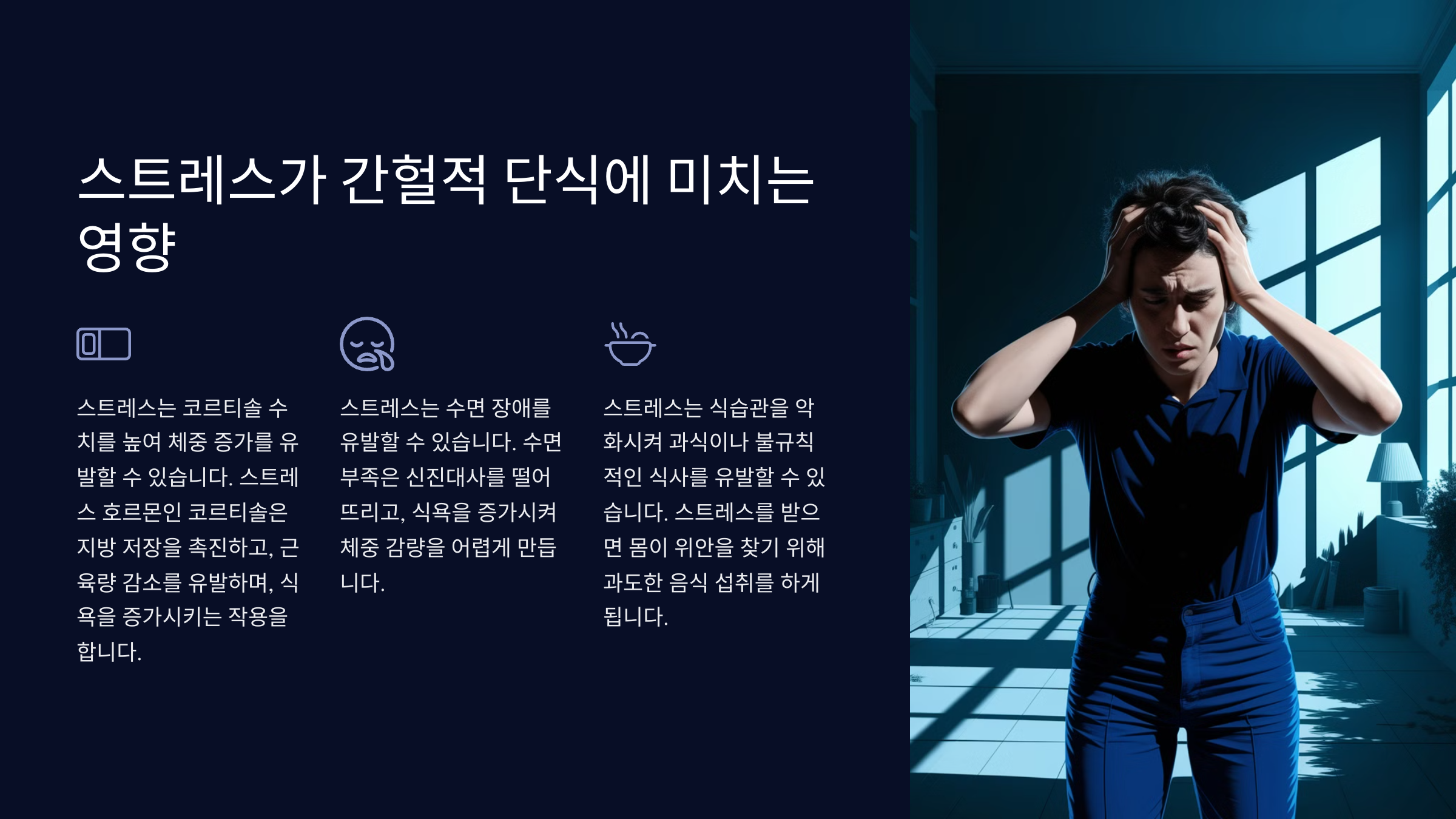 스트레스는 간헐적 단식의 효과를 방해하는 주요 요인 중 하나예요. 스트레스를 받으면 코르티솔 수치가 높아지고, 이는 지방 축적을 유발할 수 있어요.