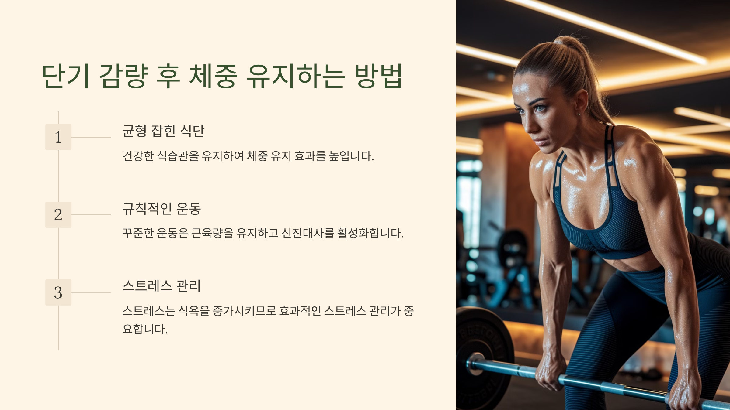 마지막으로 충분한 수면과 스트레스 관리가 필수예요. 수면 부족은 식욕을 자극하고 스트레스는 폭식을 유도할 수 있기 때문이에요. 단기 감량 후에도 이러한 요소들을 고려하면 장기적으로 건강한 체중을 유지할 수 있답니다.