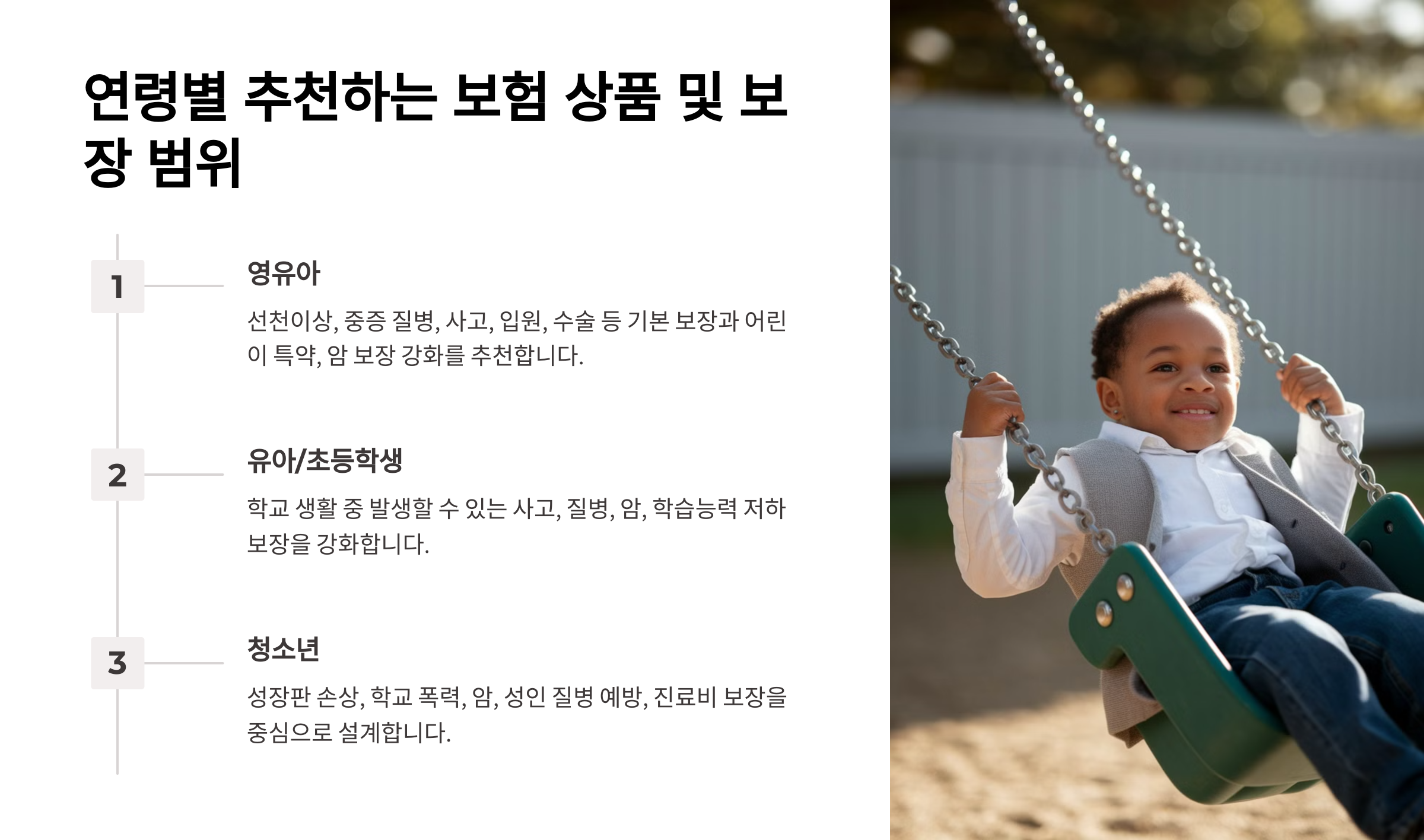 자녀의 연령에 따라 필요한 보장 범위와 보험 종류가 달라요. 성장 단계에 맞는 보험을 선택해야 보험료 낭비를 줄이고 필요한 보장을 받을 수 있어요.