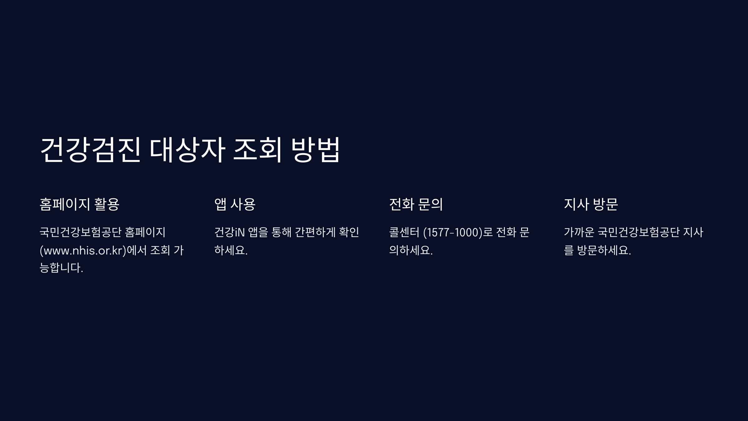 건강검진 대상자는 국민건강보험공단 홈페이지나 모바일 앱(건강iN), 또는 전화 문의를 통해 쉽게 확인할 수 있어요. 🔎