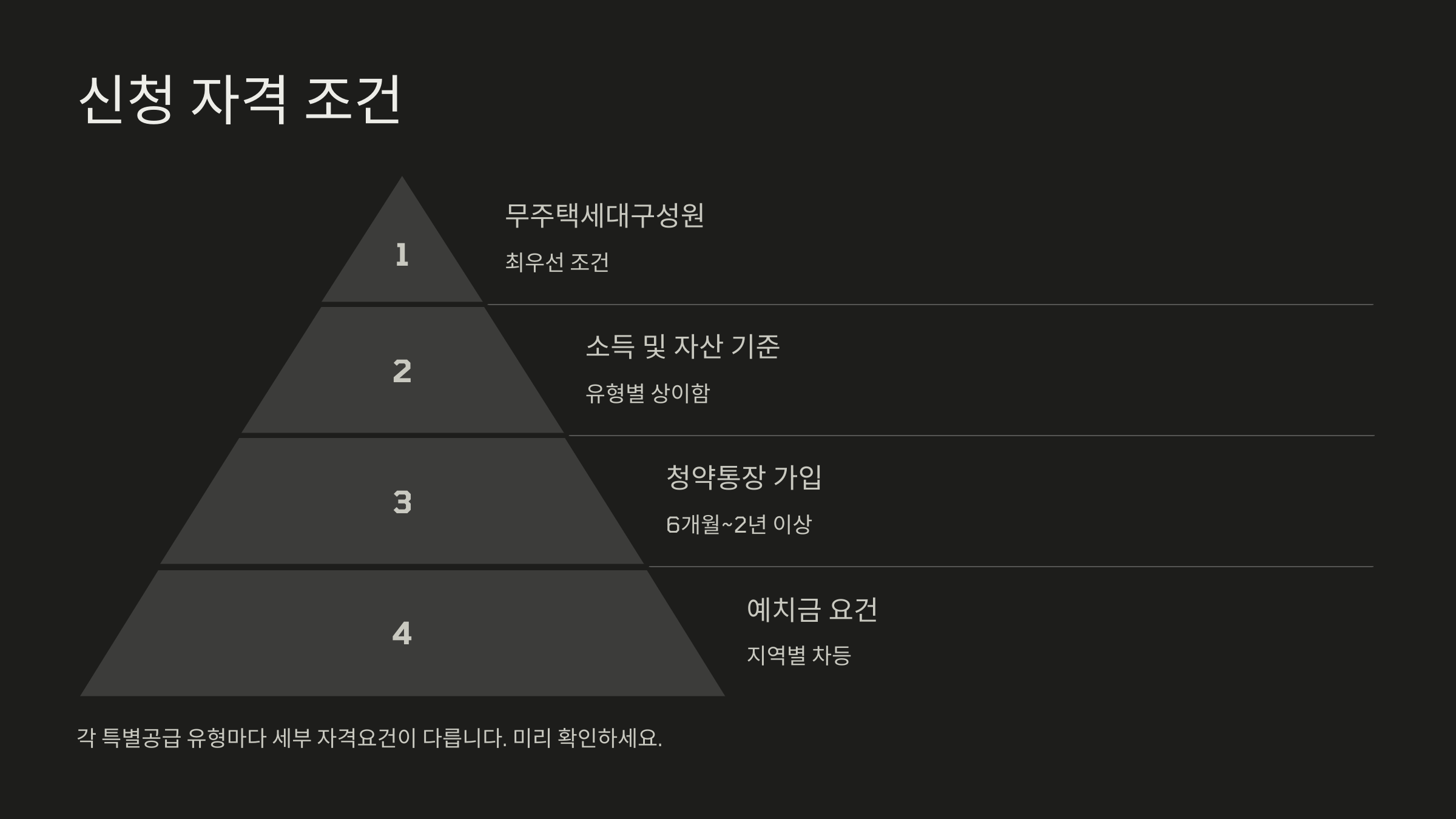자격 조건이 안 된다고 실망하지 말고, 다른 특별공급 유형이 있는지 반드시 확인해보는 것이 좋아요.
