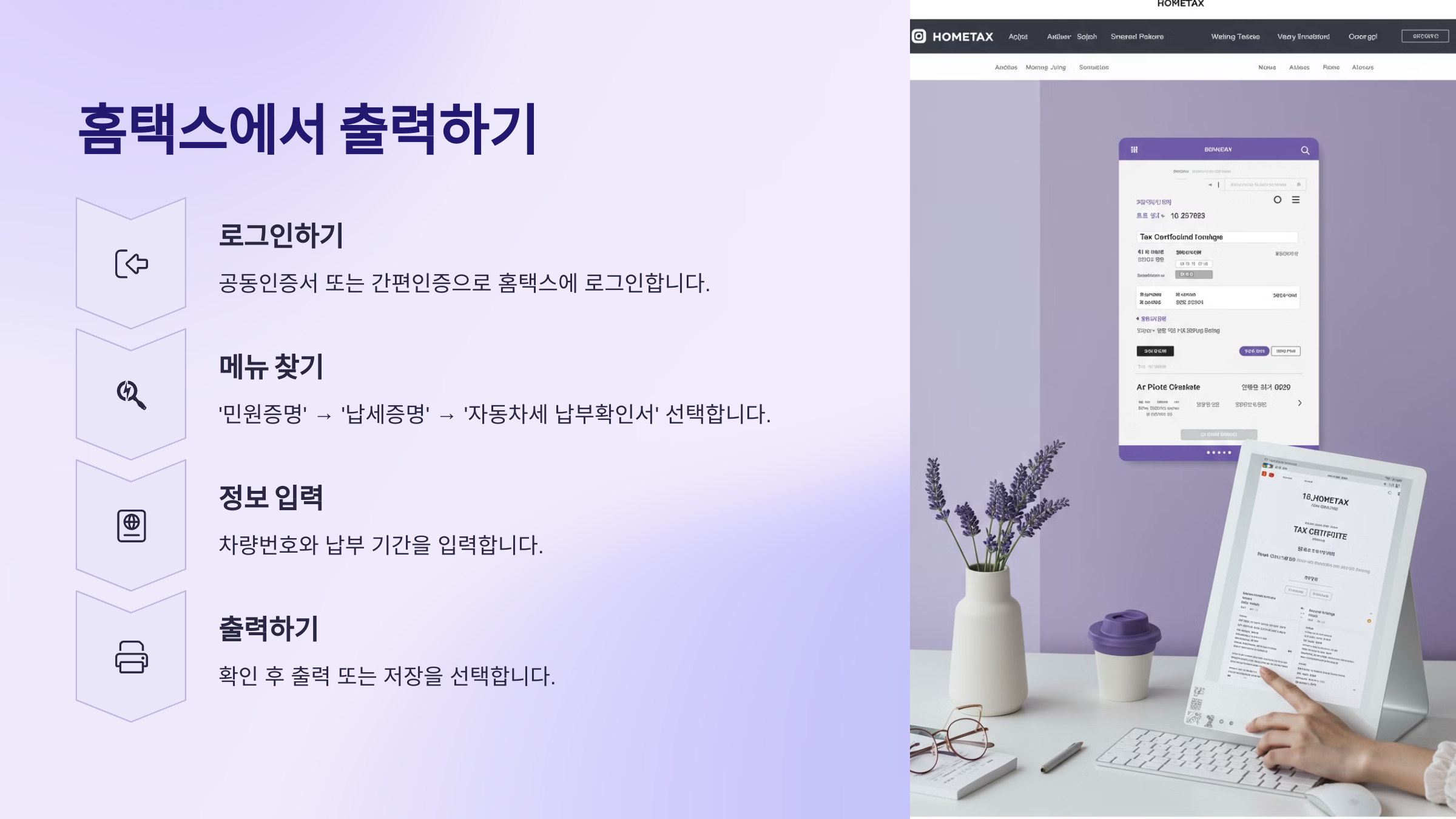 국세청 홈택스는 지방세가 아닌 국세 관련 서비스지만, 자동차세도 일부는 여기서 조회할 수 있어요.