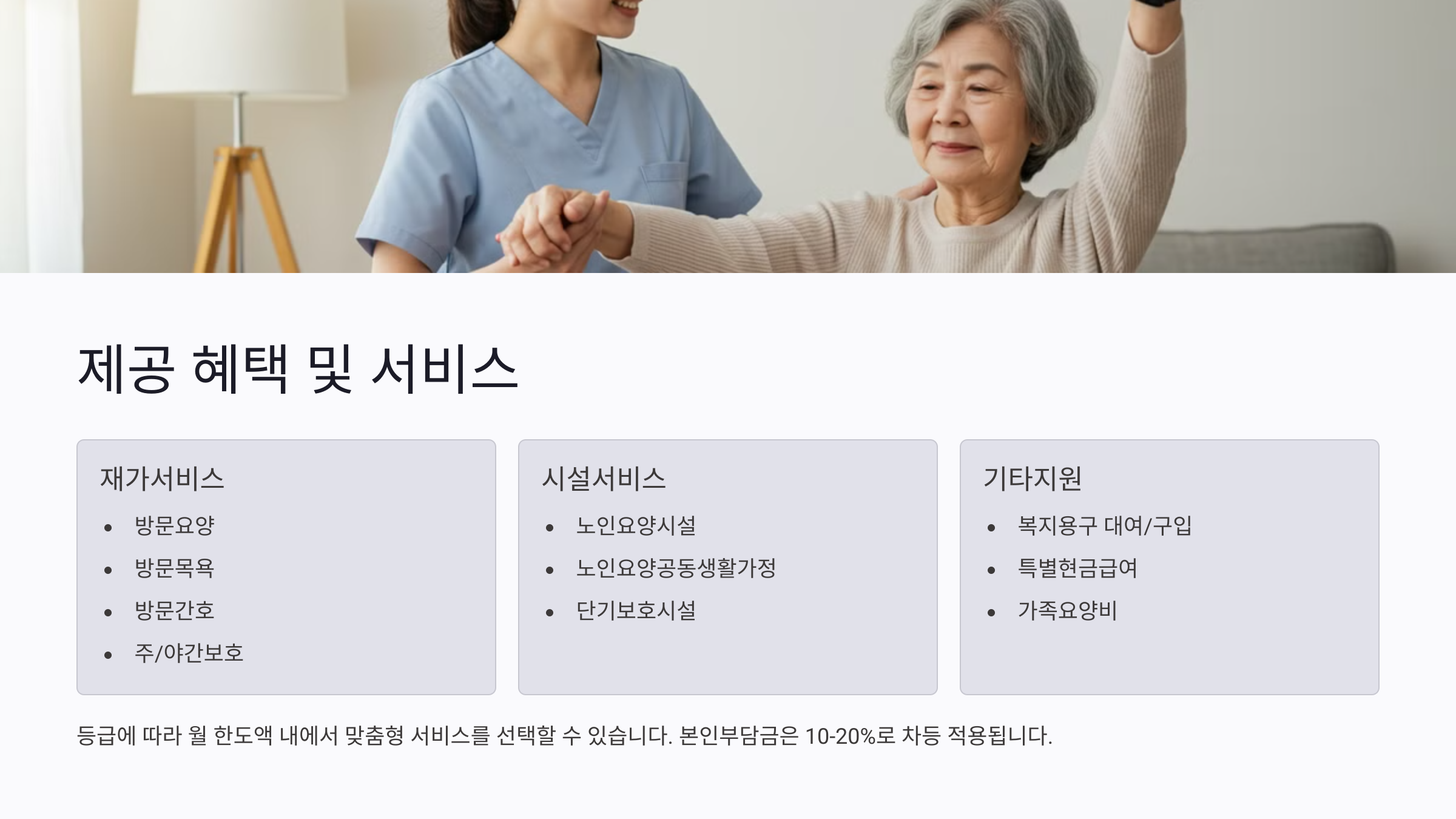 방문 요양, 방문 간호, 주야간 보호 등 맞춤형 케어가 포함되어 있답니다.