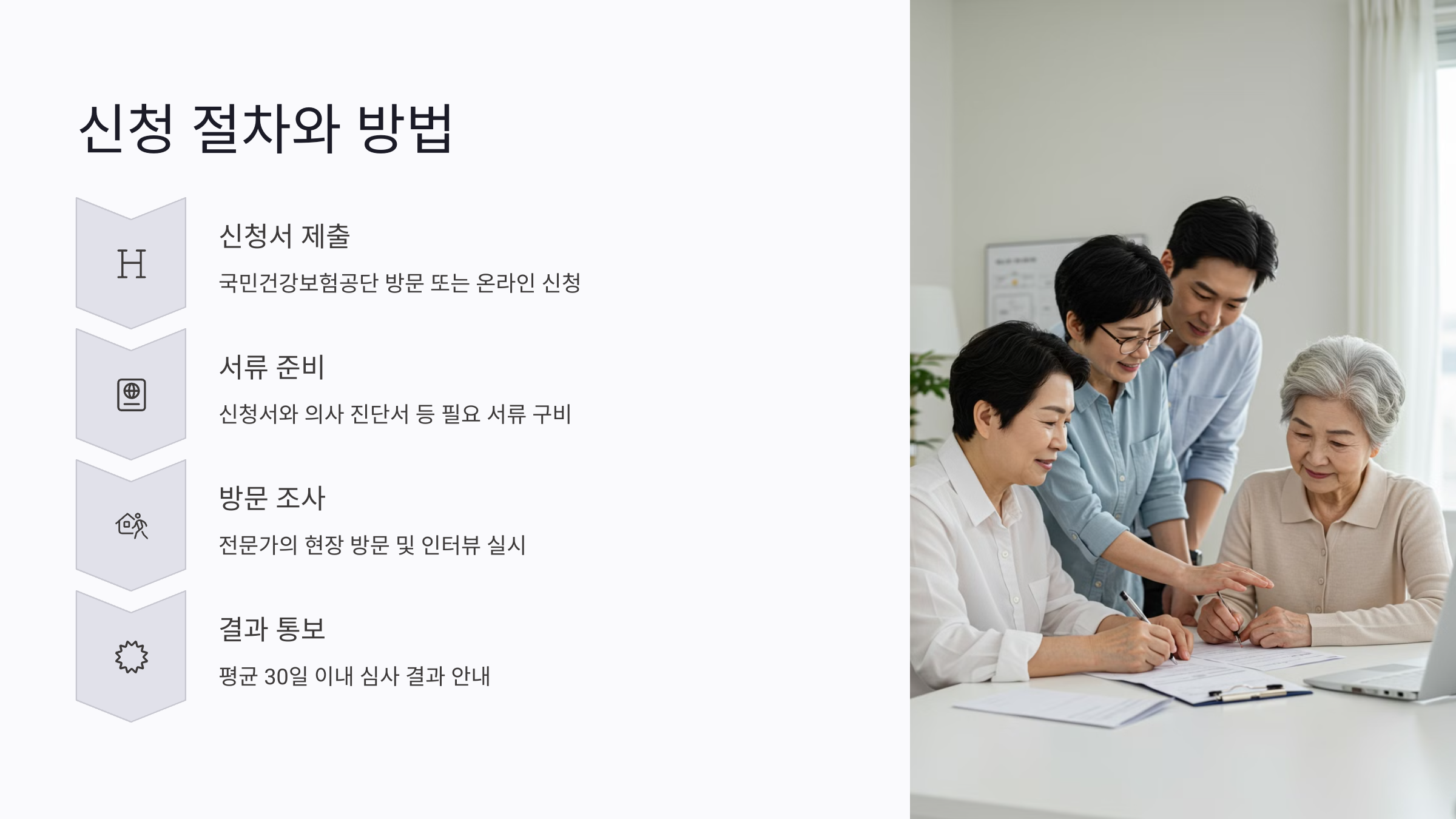 가족이 대신 신청해도 괜찮고, 신청서 양식은 공단 홈페이지나 지사에서 제공해줘요.