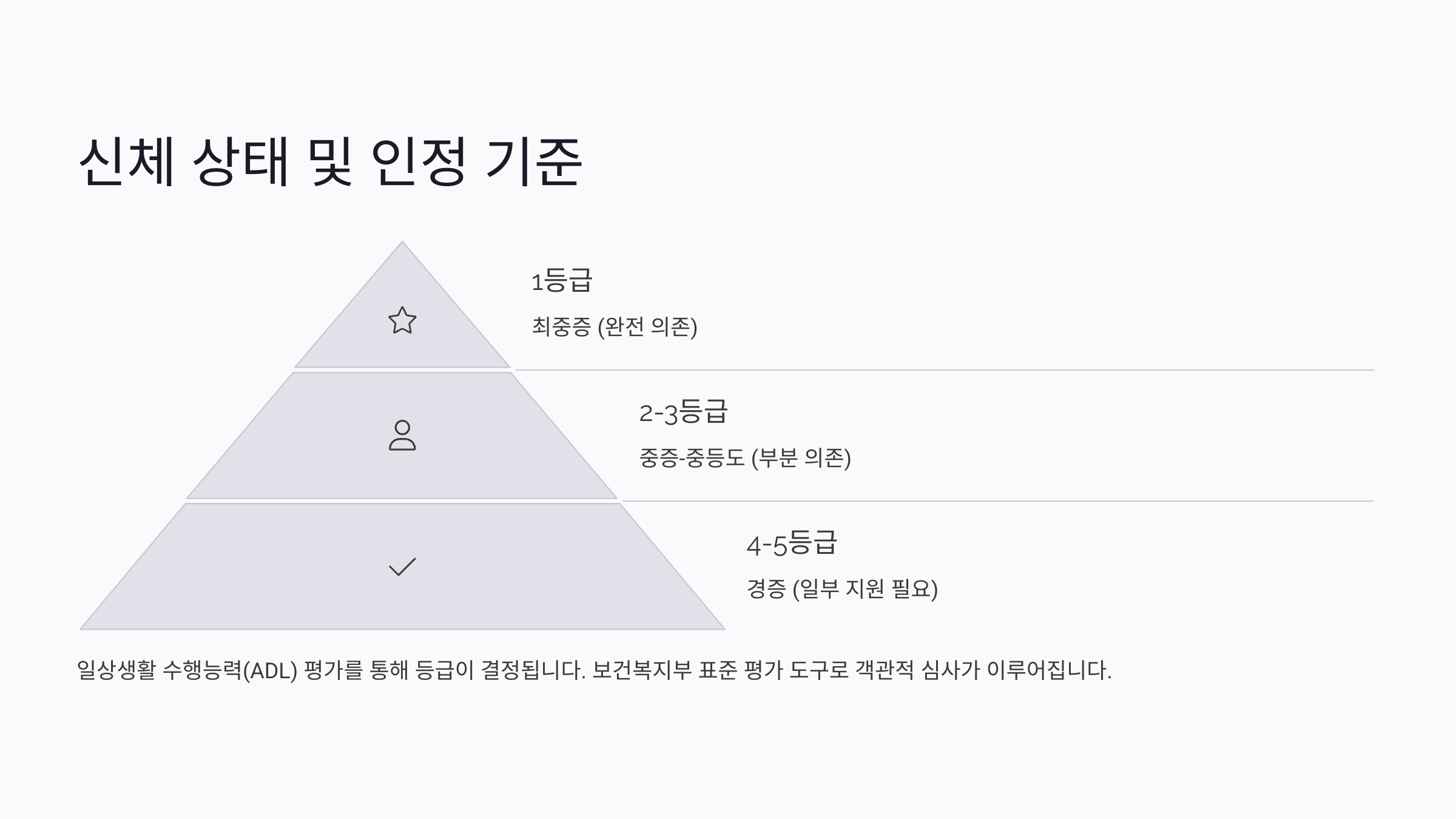 쉽게 말해 ‘몸은 건강하지만 나이만 많다’면 장기요양등급은 받기 어렵다는 뜻이에요.