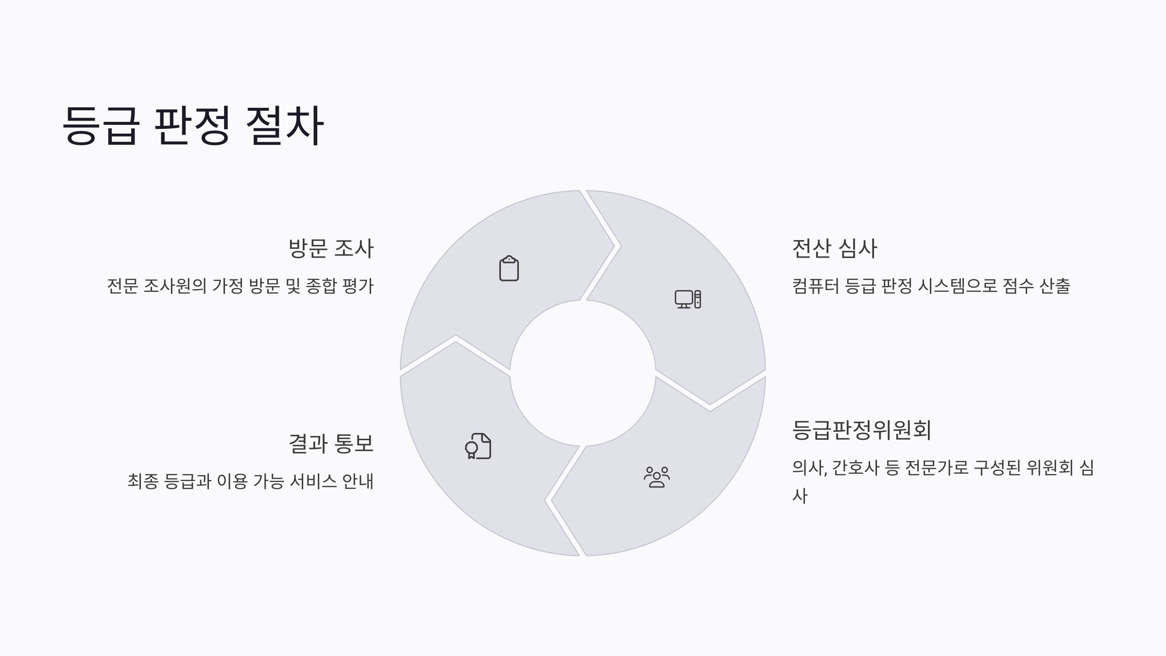 신청 후에는 등급 심사를 통해 실제로 요양이 필요한 상태인지를 판정받고, 그에 따라 다양한 서비스가 제공돼요.