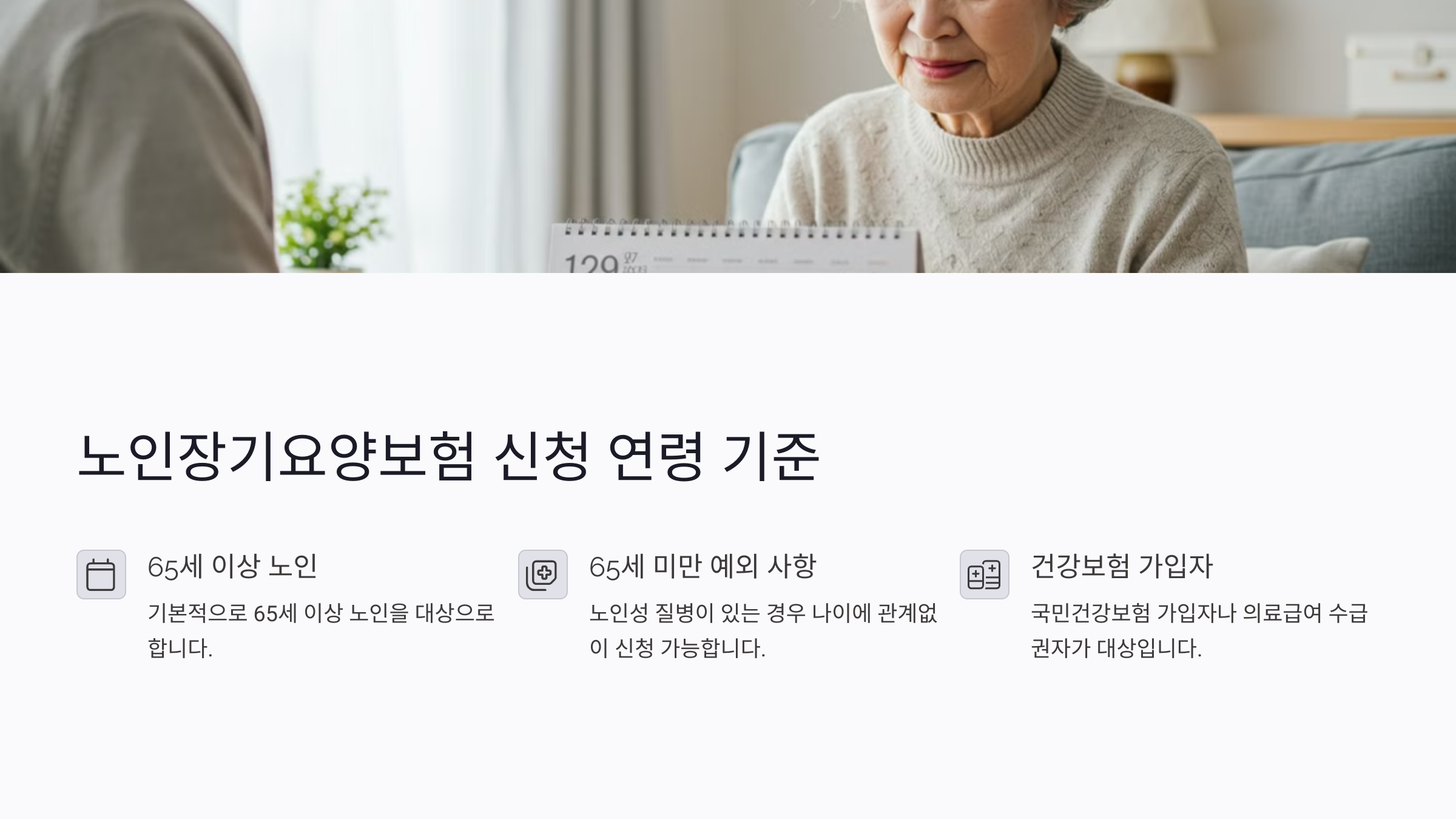 노인장기요양보험은 원칙적으로 만 65세 이상이라면 누구든 신청할 수 있어요.