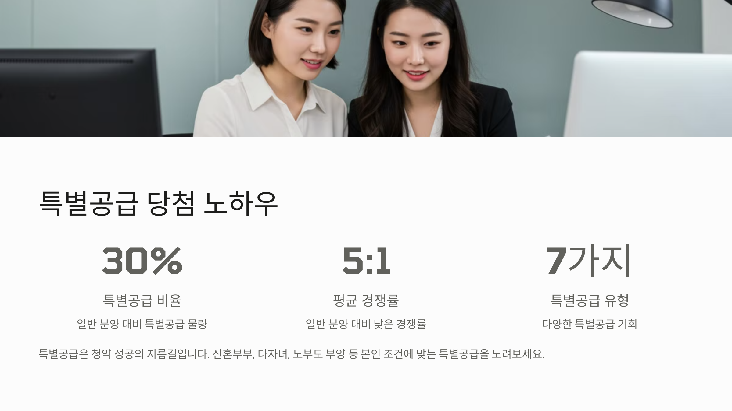 청약 당첨 확률을 높이고 싶다면, '특별공급'을 노려야 해요. 일반공급보다 경쟁률이 낮고, 가점 없이도 당첨 기회가 생길 수 있거든요.