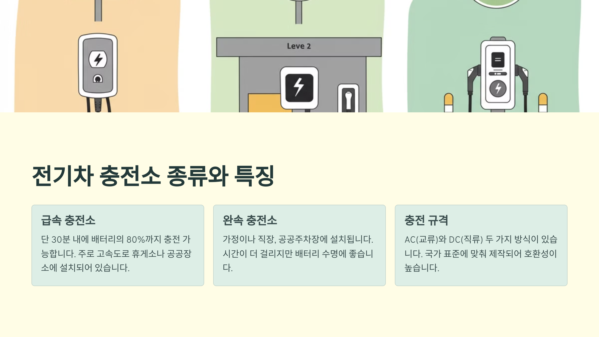 | 급속 | 빠름 | 20~40분 | 고속도로, 공공시설 | 비교적 비쌈, 긴급 충전용 |