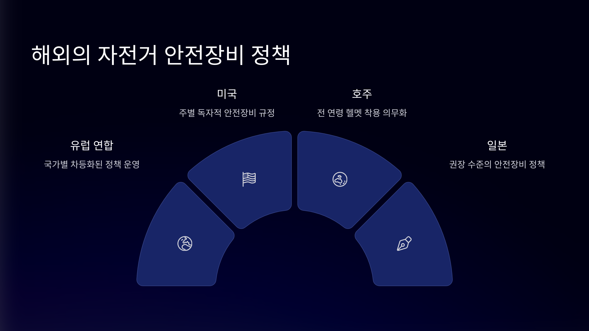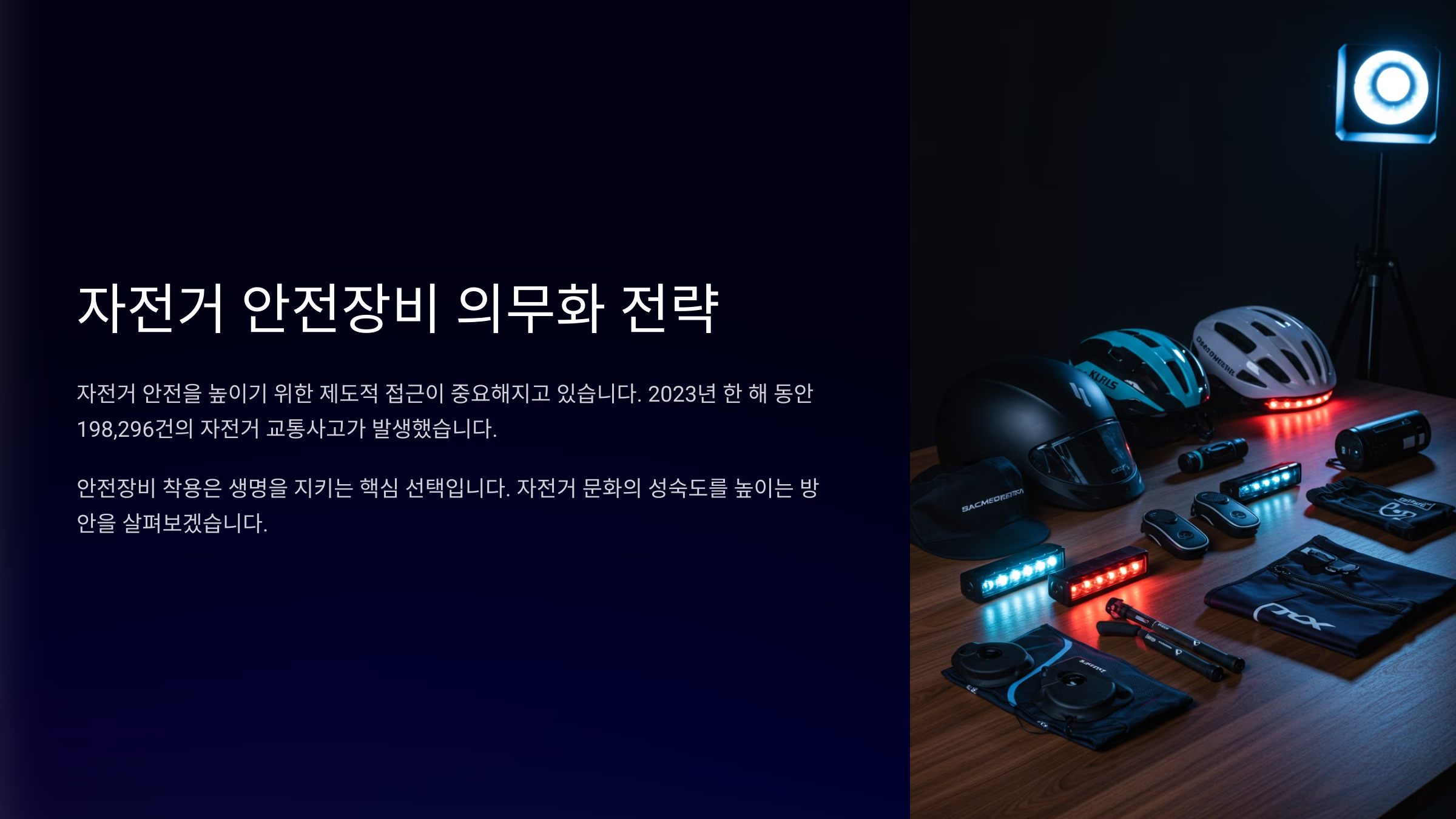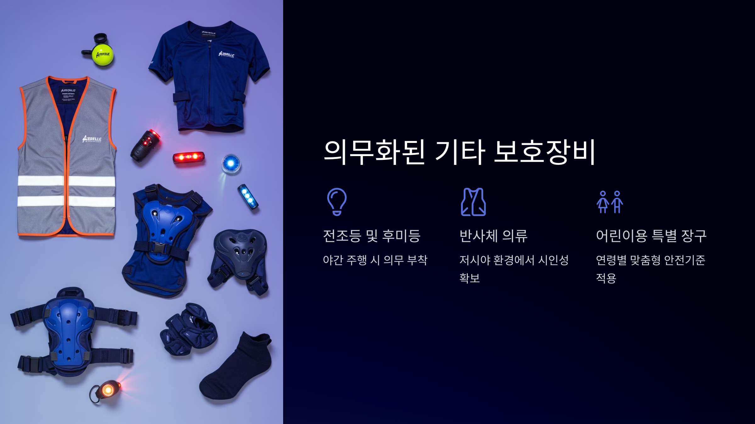 이런 문제들을 해결하고 사고 시 피해를 줄이기 위해 자전거 안전장비 의무화 정책이 도입된 거예요.