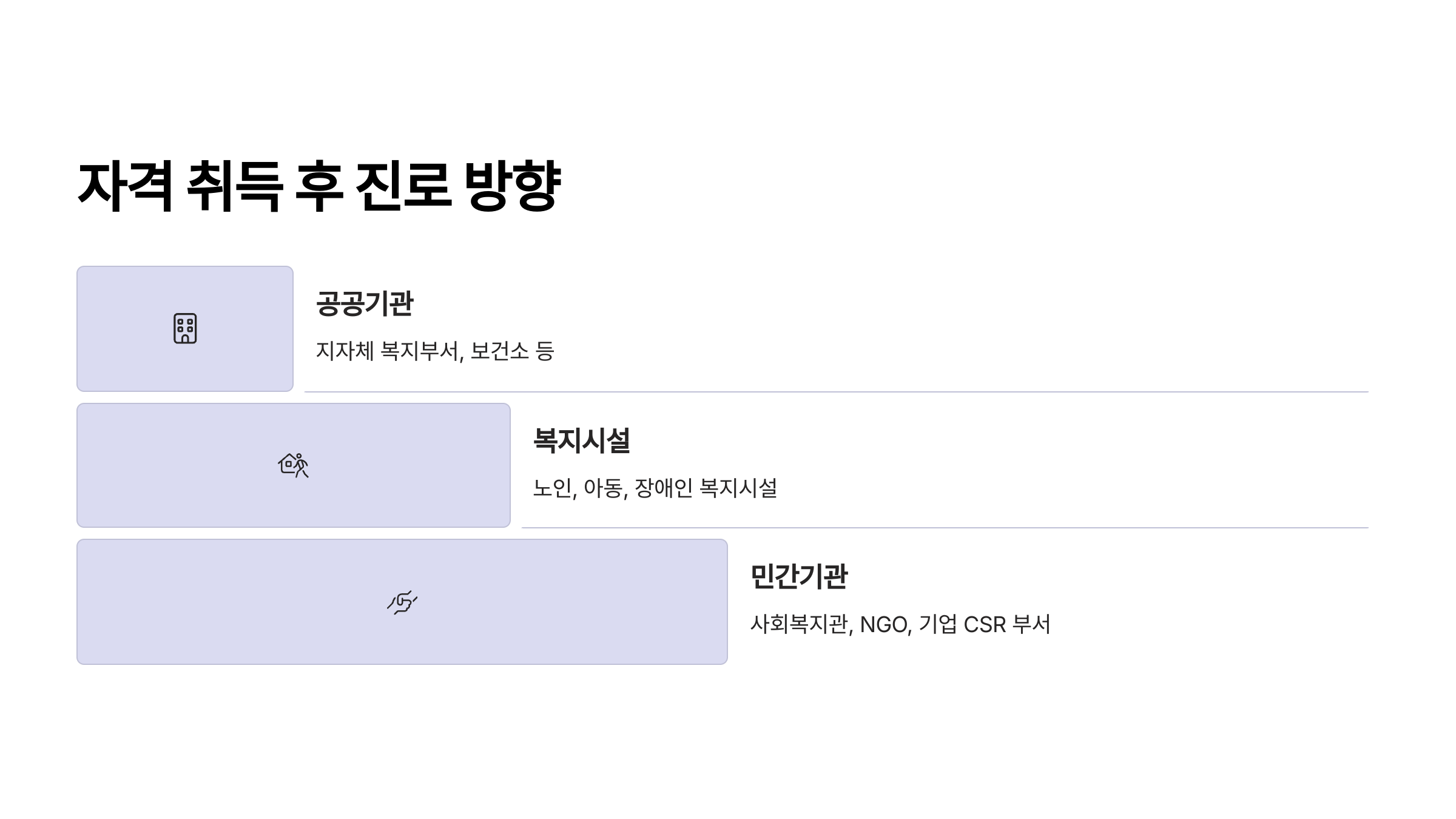정리하자면, 사회복지사 2급은 자격증 하나로 취업, 공무원, 창업까지 가능한 꽤 강력한 진로 자원이에요.