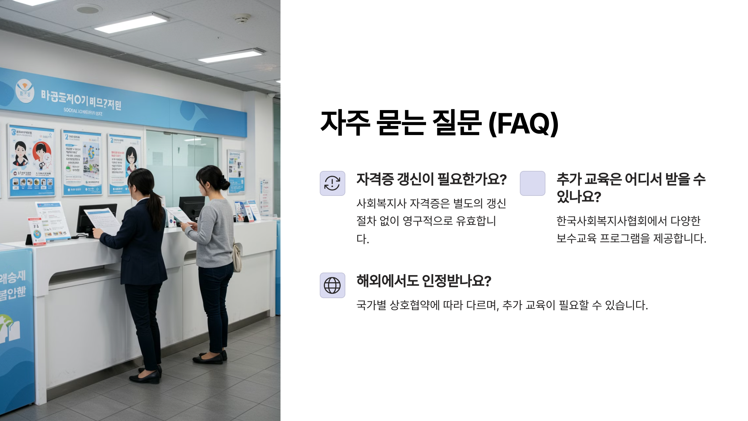 이수 후 자격증은 한국사회복지사협회를 통해 발급되며, 보건복지부 장관 명의의 국가 공인 자격증이에요. 🏅