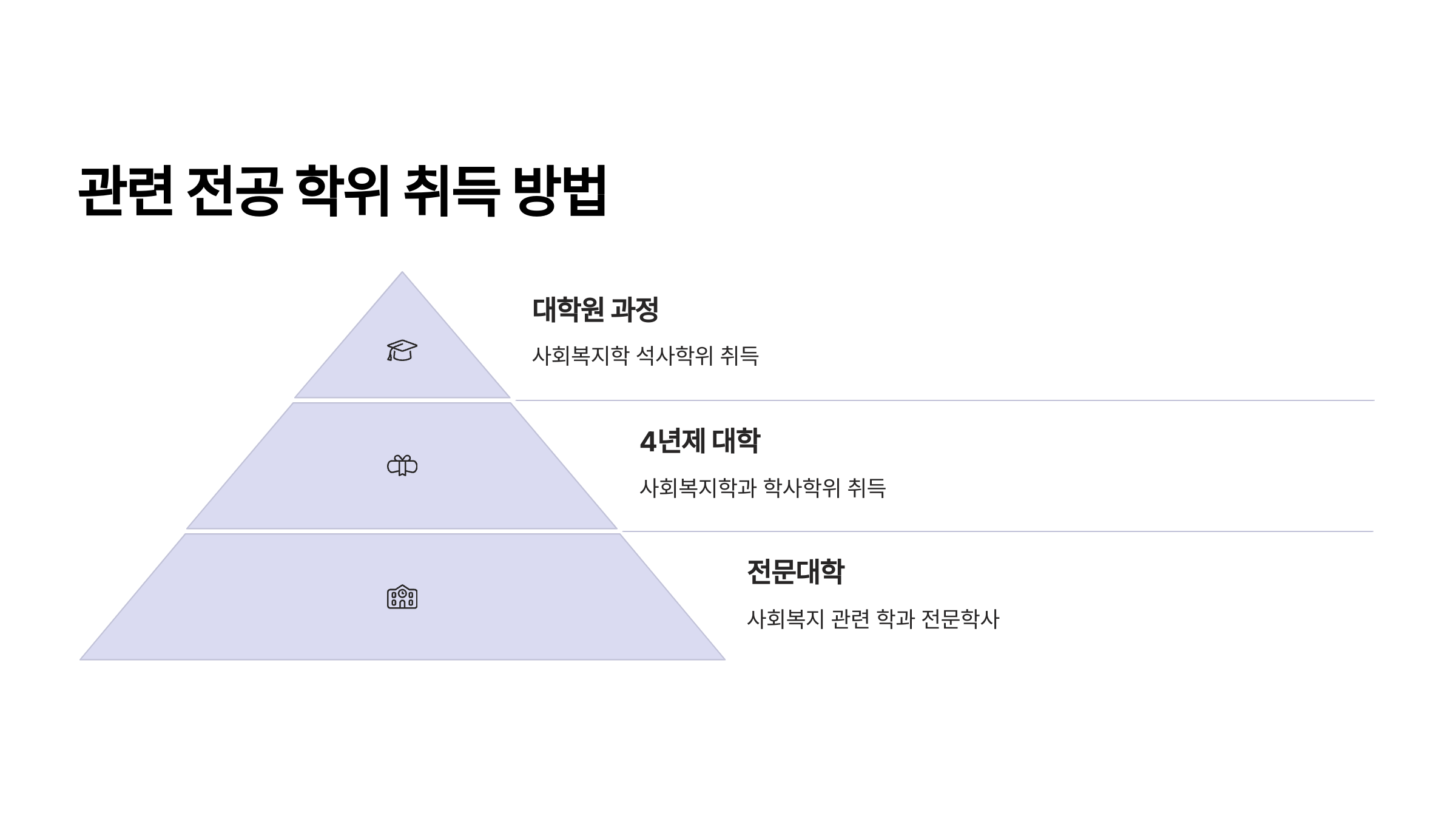 사회복지학, 사회복지학과, 복지행정학, 노인복지학 등 복지 관련 학과로 전문대 또는 4년제를 졸업하면 자격이 부여돼요.