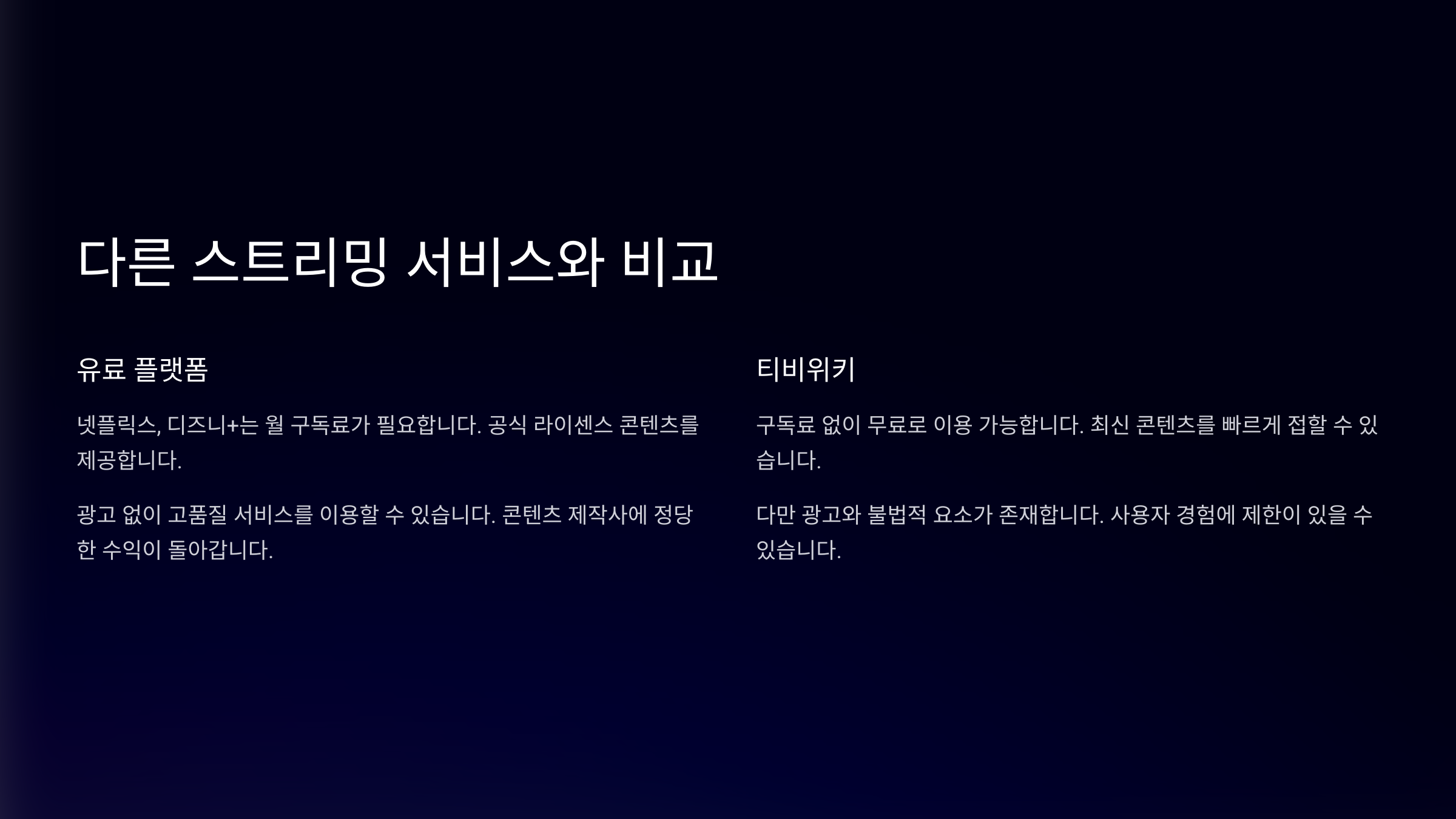 많은 사람들이 티비위키를 '무료 대체 서비스'로 생각하지만, 정식 OTT 서비스와 비교했을 때 큰 차이가 있어요.