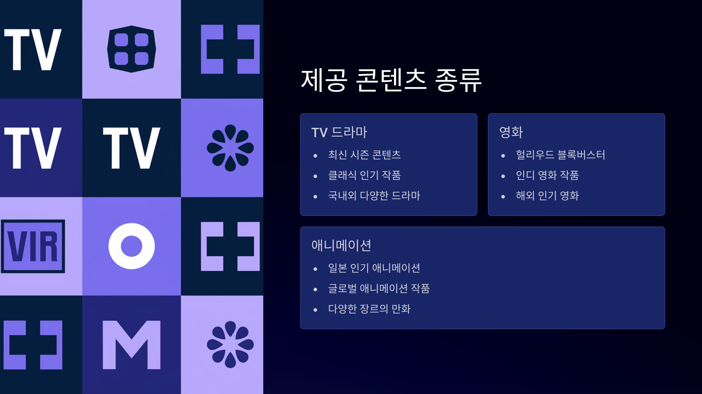 특히 TV 방송 다음 날 바로 업로드되는 K-드라마와 예능 콘텐츠가 가장 인기 많아요. 또한 미국, 일본, 중국 드라마도 자막이 포함되어 제공되기 때문에 해외 시청자들도 접근하기 쉽죠.
