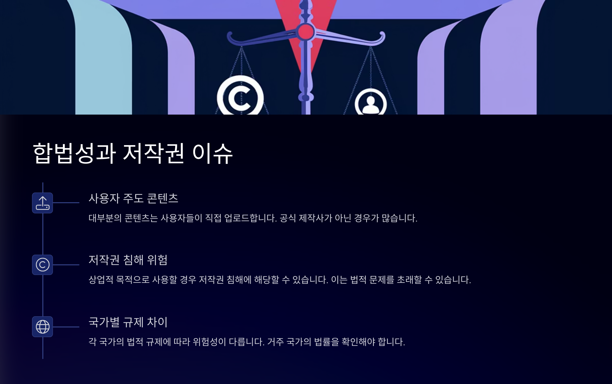 | 법적 문제 | 저작권 침해 가능성 있음 | 합법적 콘텐츠 유통 |