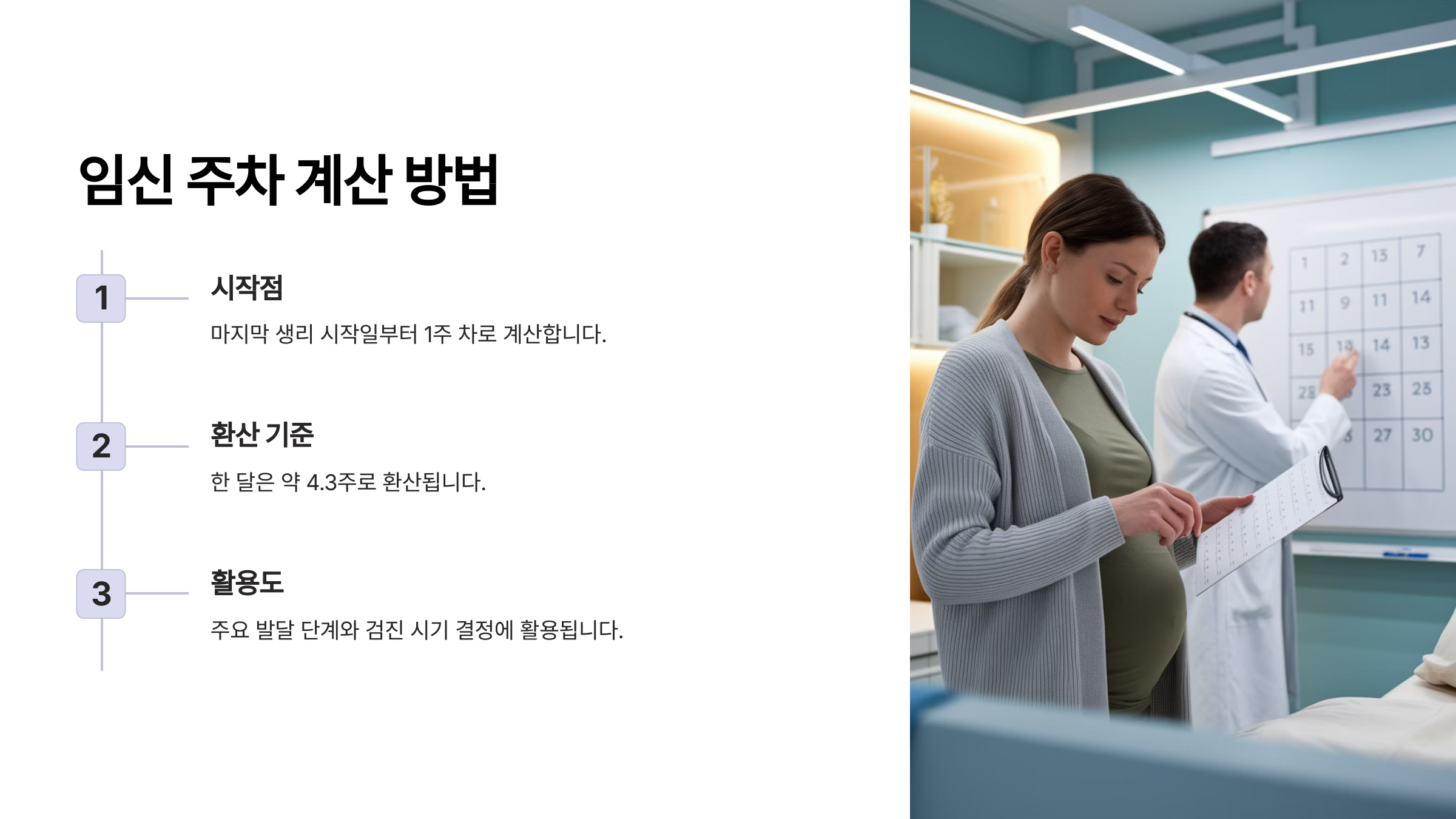 임신 주차 계산의 핵심은 ‘마지막 생리 시작일’을 기준으로 며칠이 지났는지를 계산하는 거예요. 병원에서도 이 방법을 가장 기본으로 사용한답니다. 🩺