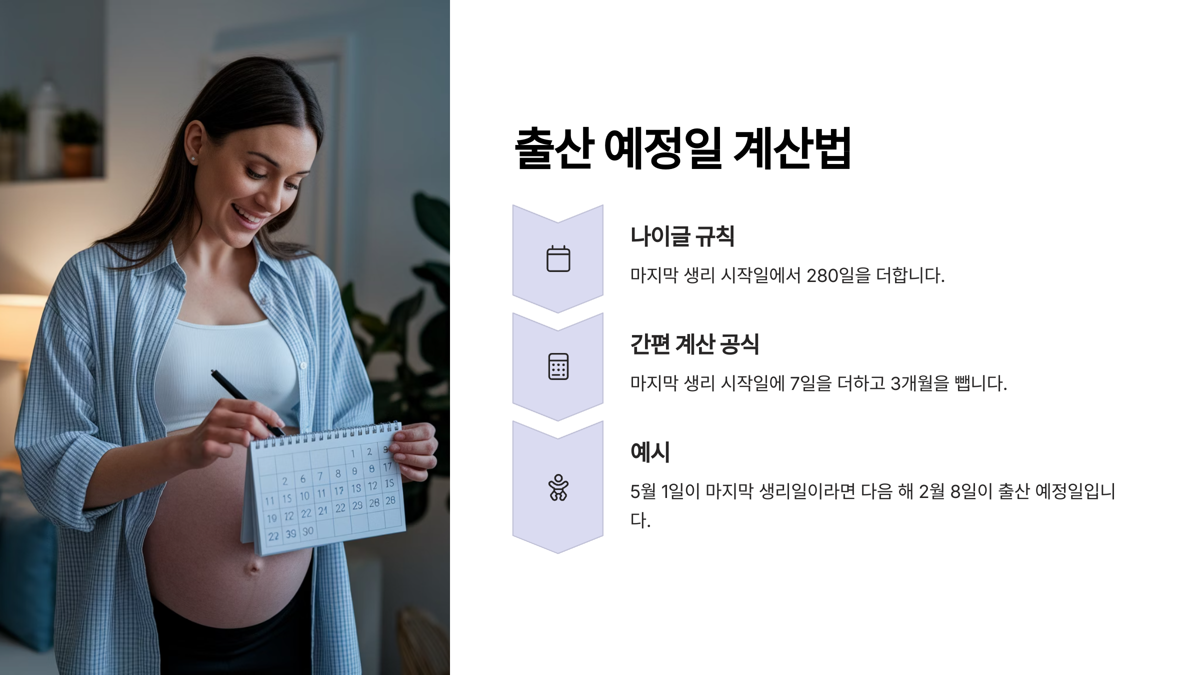 계산기를 쓰지 않고도 간단히 계산할 수 있는 꿀팁은 “마지막 생리일 + 280일 = 출산 예정일”이라는 것! 이 날짜를 중심으로 역산하면 임신 주차도 쉽게 나와요. 📅